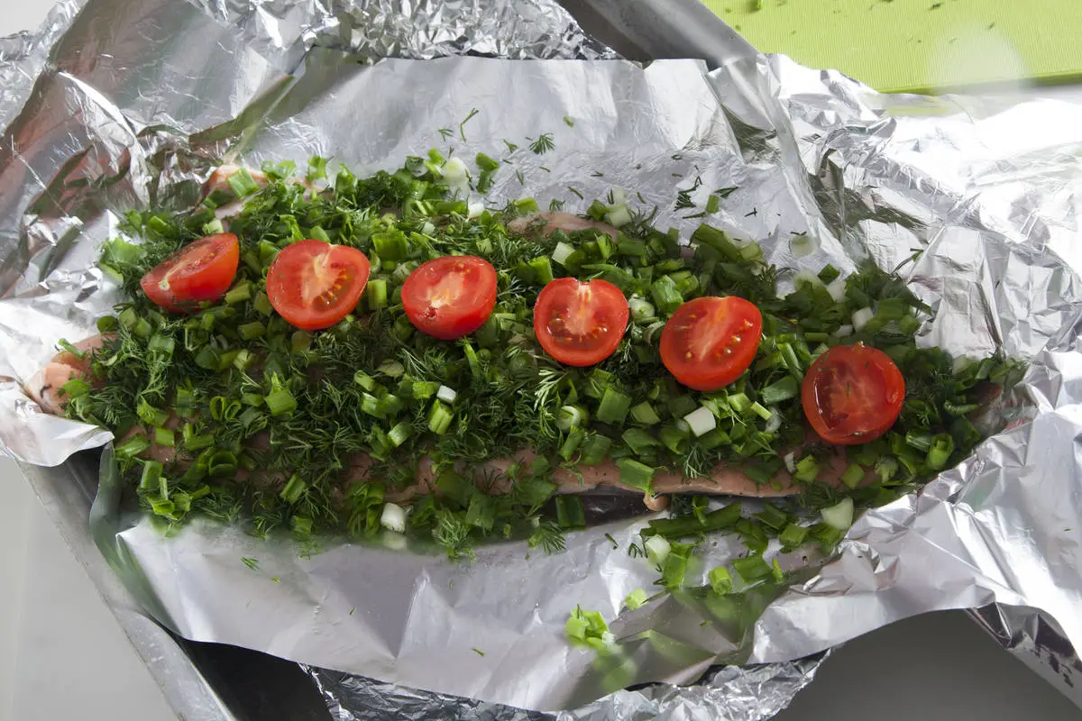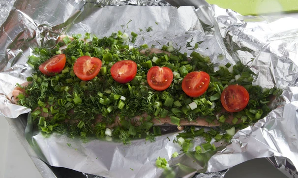 Травы нарубите и выложите поверх филе, сверху разложите колечки помидора, полейте оливковым маслом, заверните плотно в фольгу (лучше в два слоя) и запекайте в разогретой до 190 С духовке 20 минут — готово! Такую рыбу не стыдно подать на праздничный стол, предварительно разрезав на порционные кусочки или взять с собой в качестве здорового обеда, она вкусна и холодной, и горячей.
