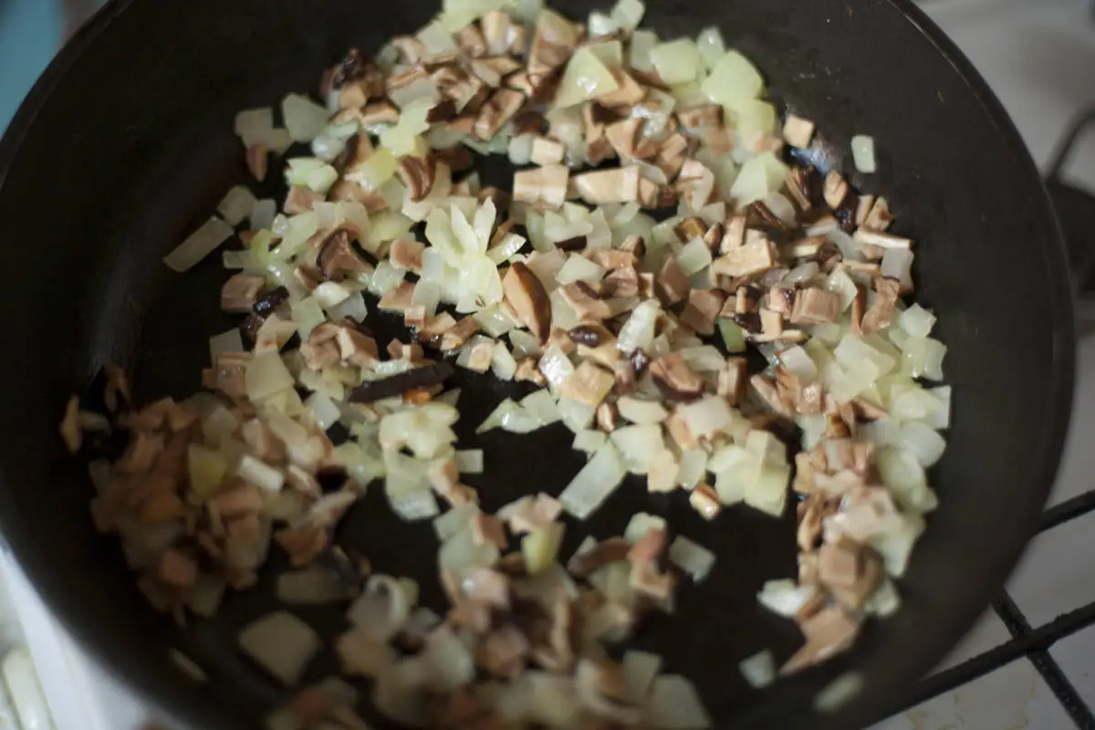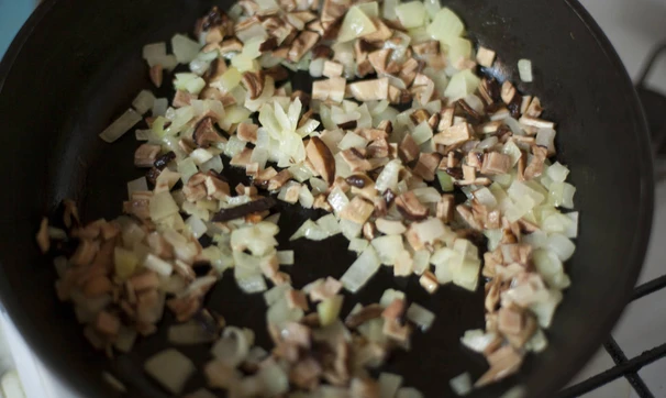 Грибы слегка отожмите, мелко порежьте и обжарьте вместе с мелко нарезанным луком.