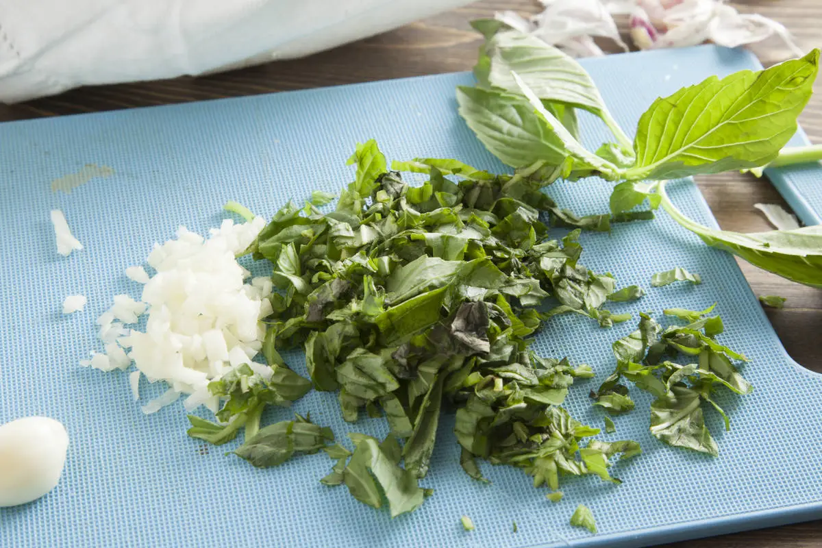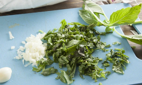 Растопите сливочное масло, добавьте мелко порубленные чеснок и листья базилика, перемешайте.