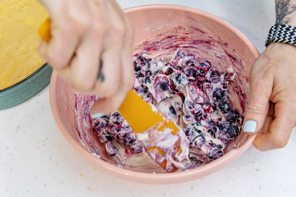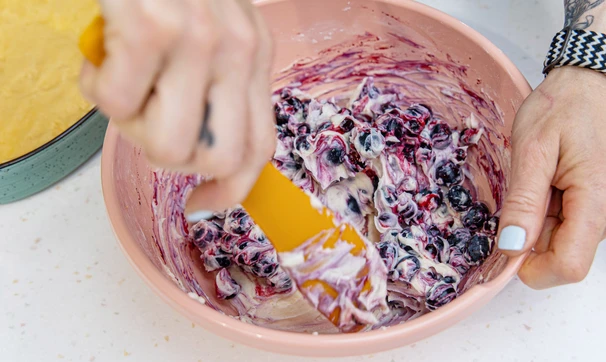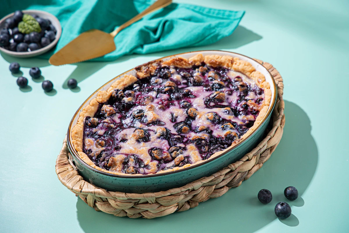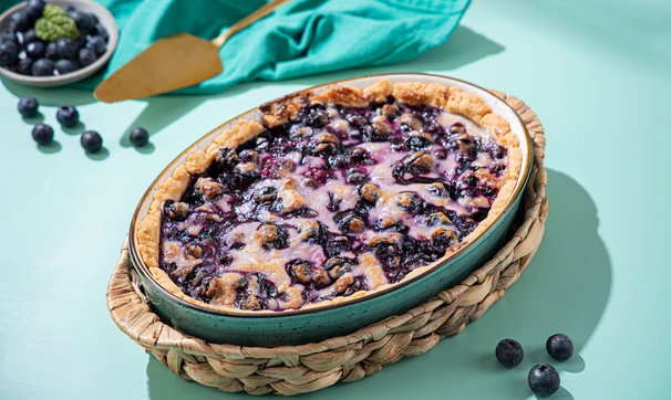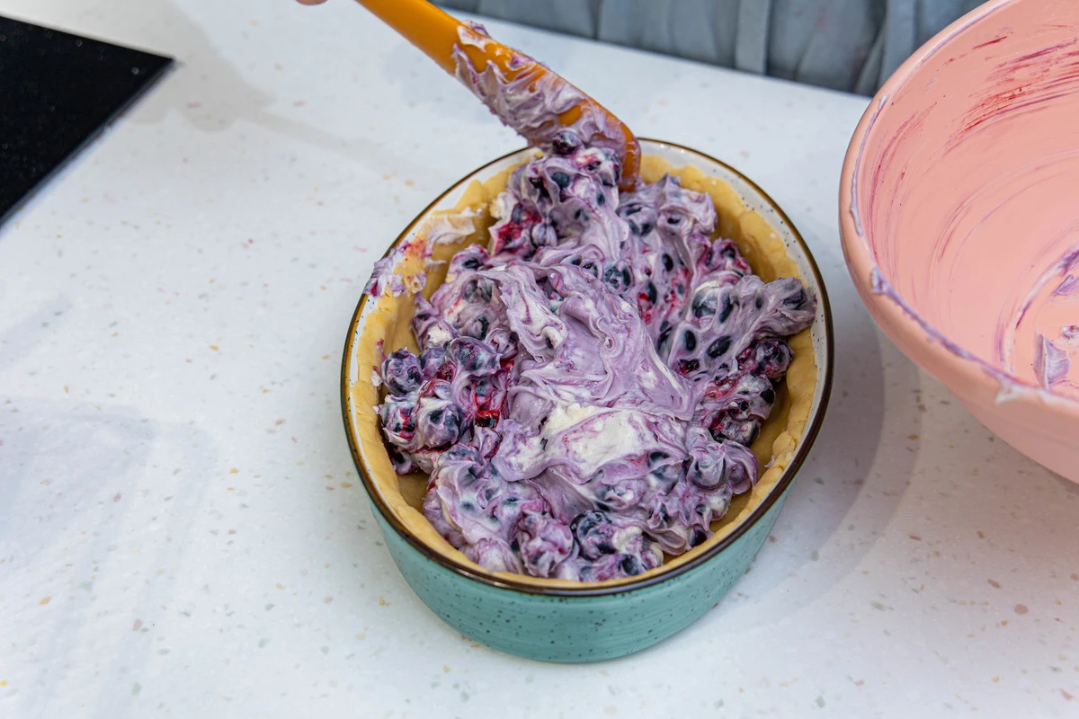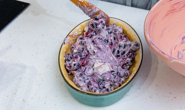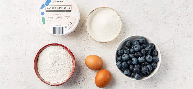 Этот пирог часто готовят со сметаной или сливками, а мы решили сделать с маскарпоне — получилось очень нежно. В смесь черники и голубики добавили немного смородины для цвета и аромата.