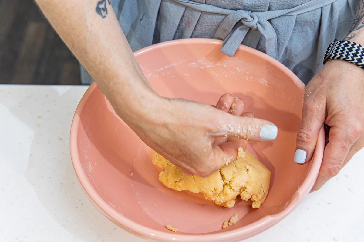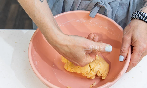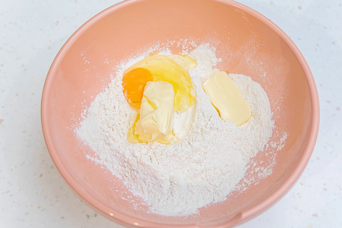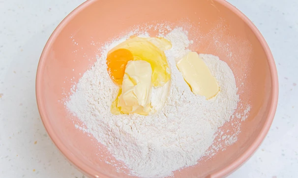 Муку просейте в миску, добавьте мягкое масло, перетрите вилкой или руками. Разбейте одно яйцо.