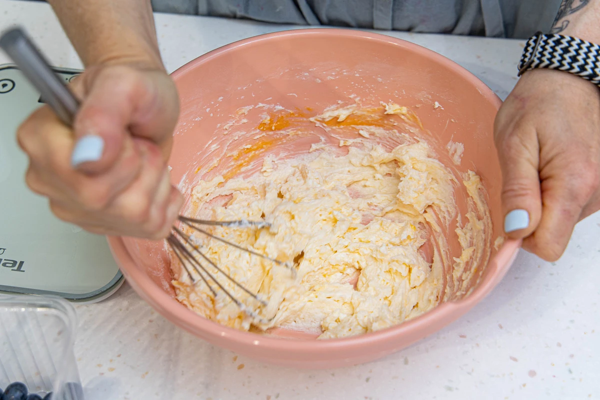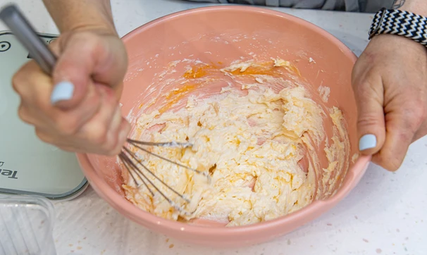 Смешайте сахар, ещё одно яйцо и маскарпоне с помощью венчика.