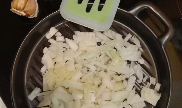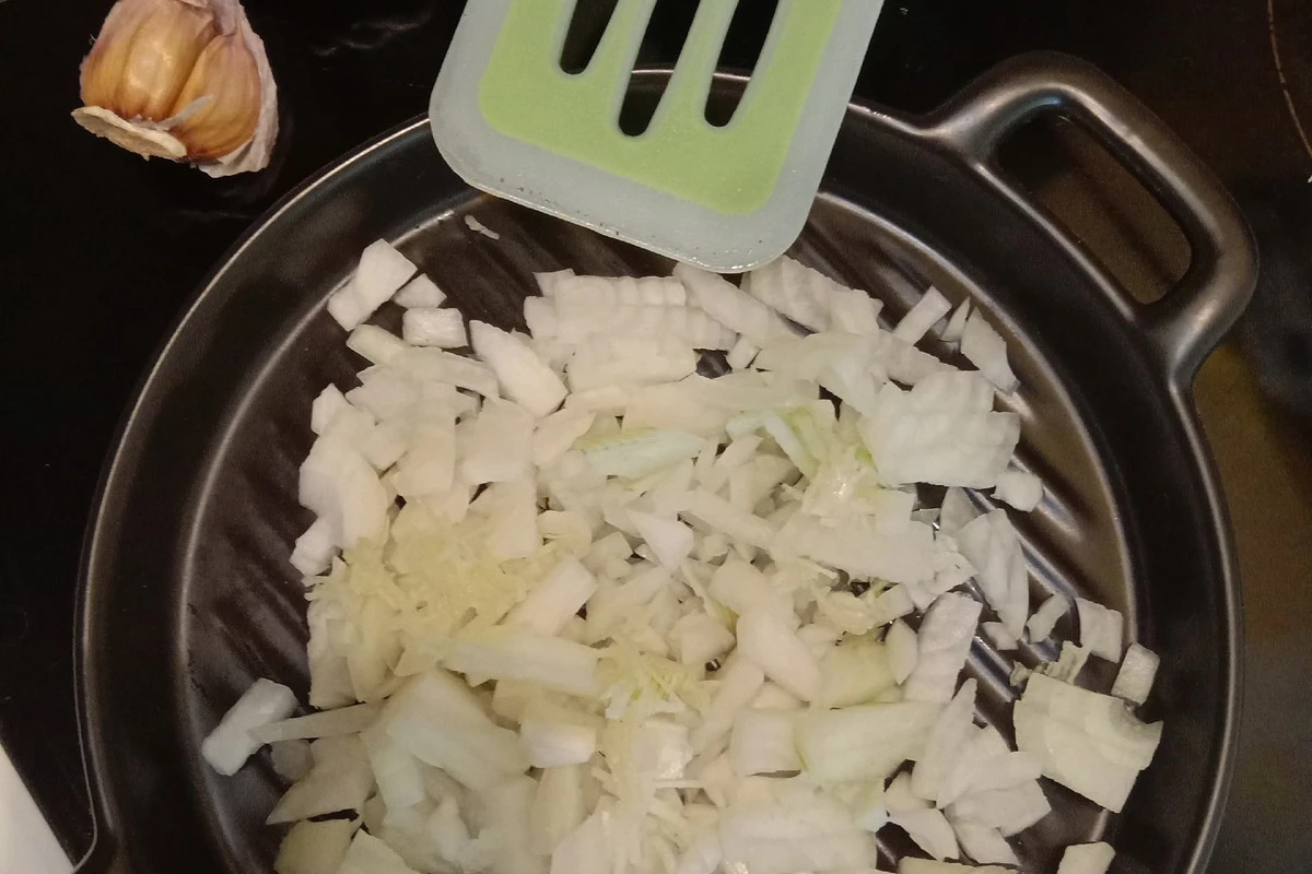 Лук и чеснок нарежьте мелко. Обжарьте их 2-3 минуты на среднем огне до полуготовности.