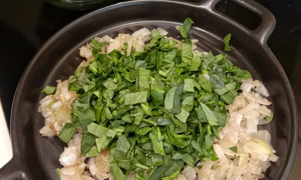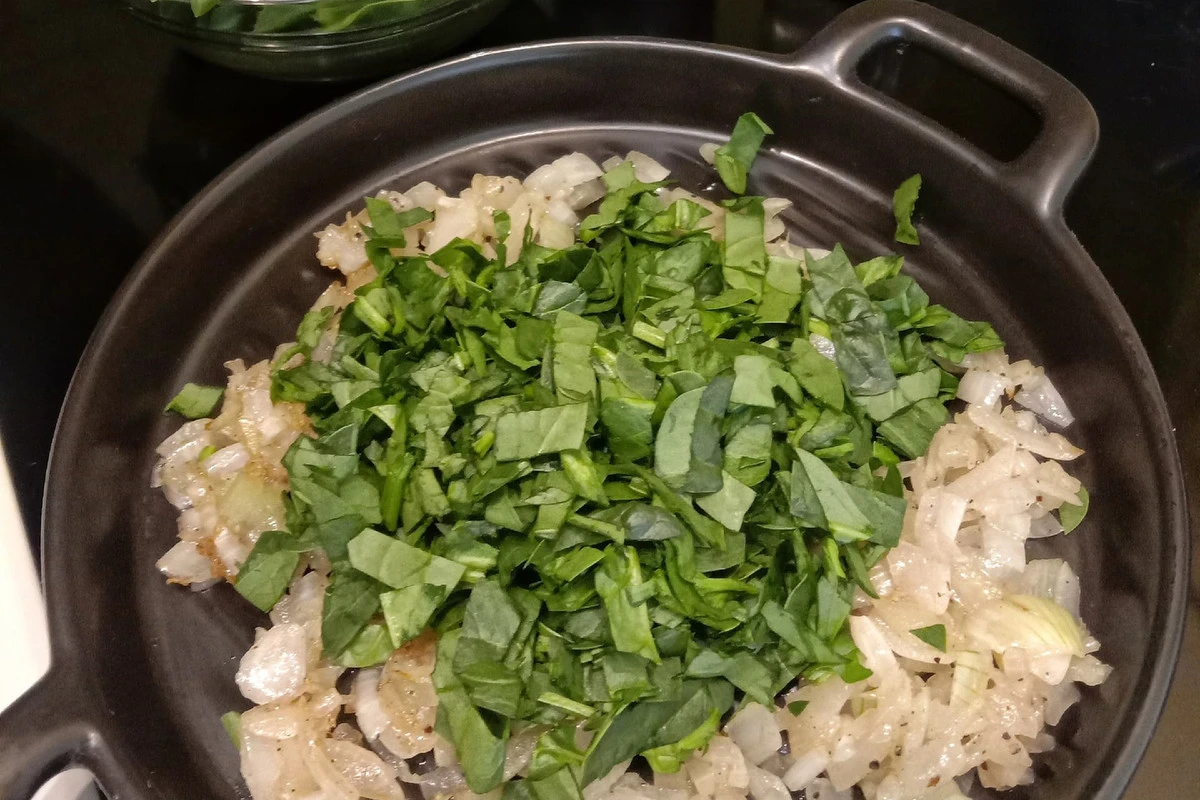 Добавьте в сковороду измельчённый шпинат. Готовьте, помешивая, минуты 3. Добавьте сок четвертинки лимона, перемешайте и снимите с огня. Немного остудите.