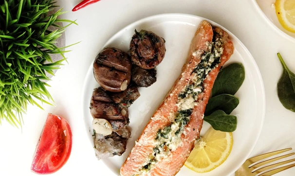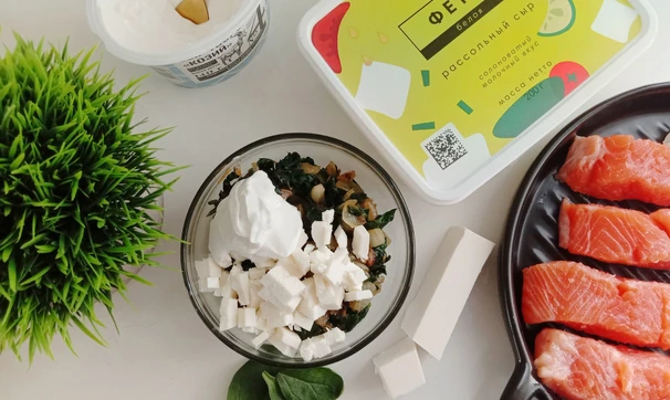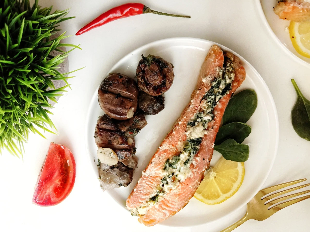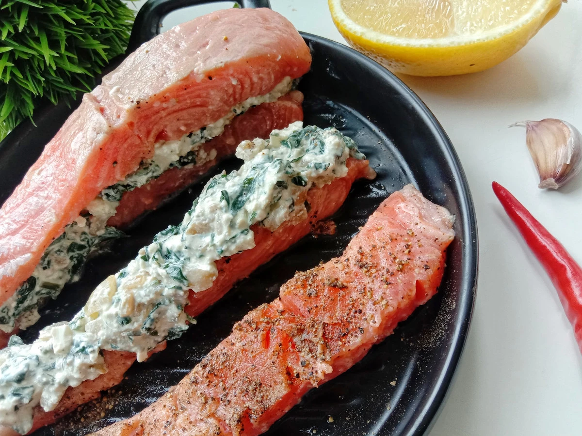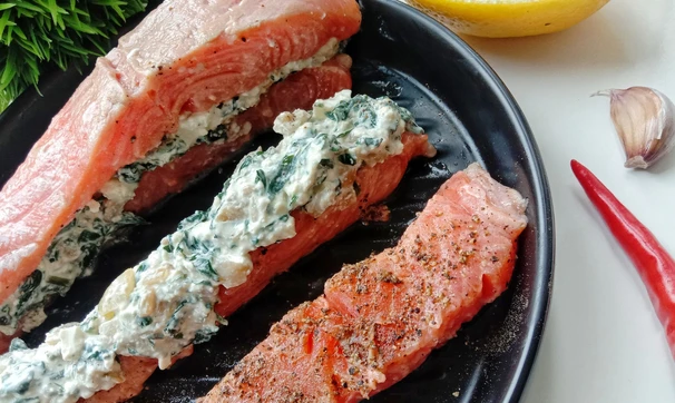 Форель, фаршированная шпинатом, фетой и козьим сыром