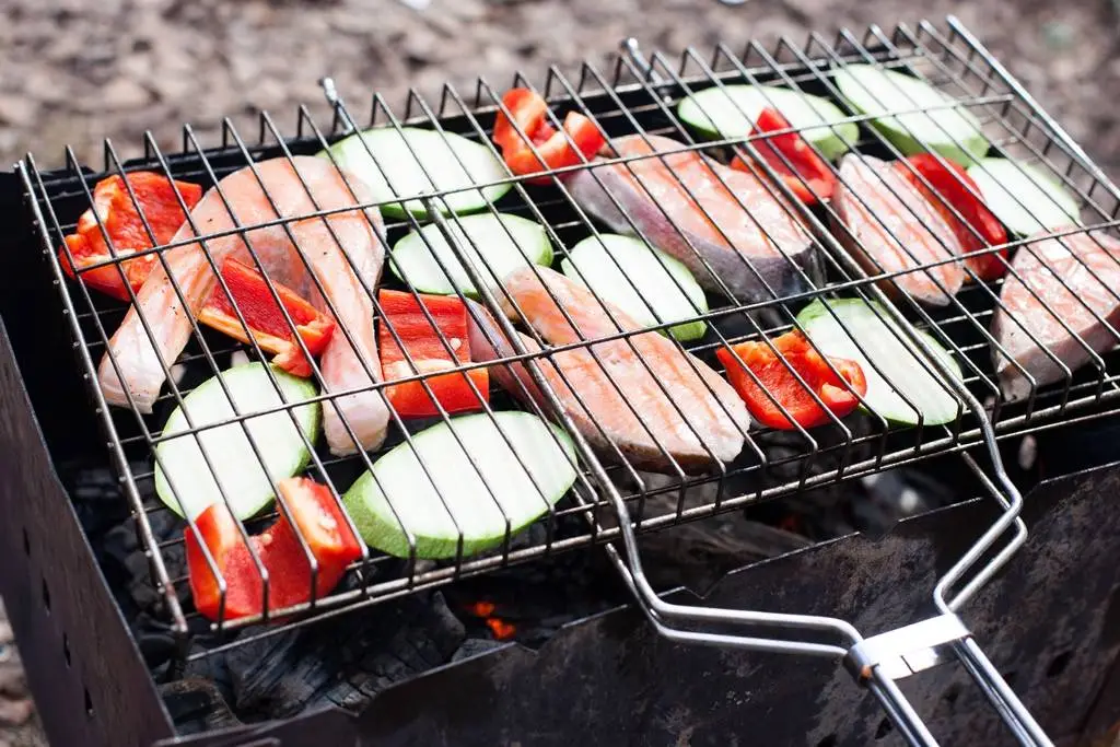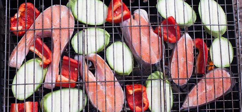 Подготовленную форель (правильно размороженную и обсушенную салфетками) выложите на смазанную маслом решетку гриля, добавьте нарезанный тонкими кружочками кабачок и кусочки болгарского перца, закройте решетку.