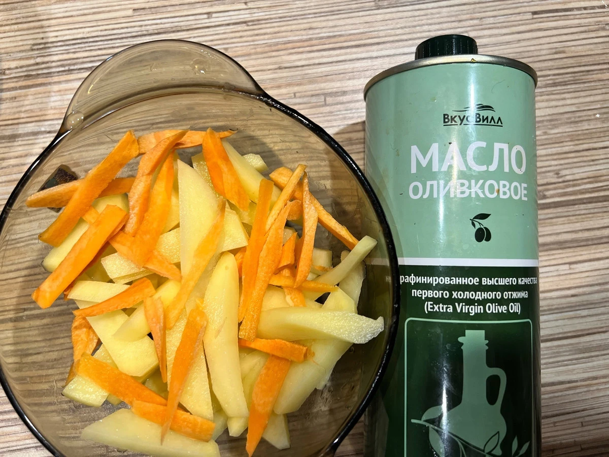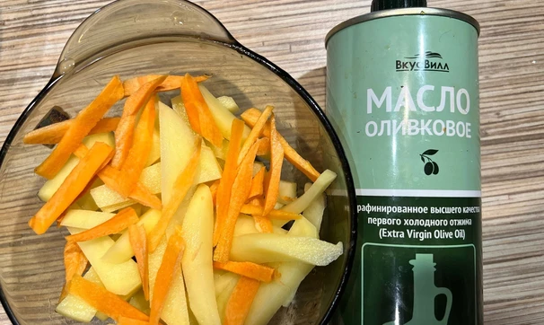 Нарежьте соломкой все овощи. Посолите и сбрызните их оливковым маслом, перемешайте.