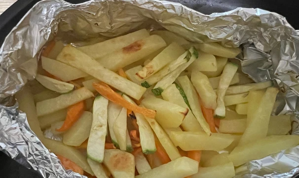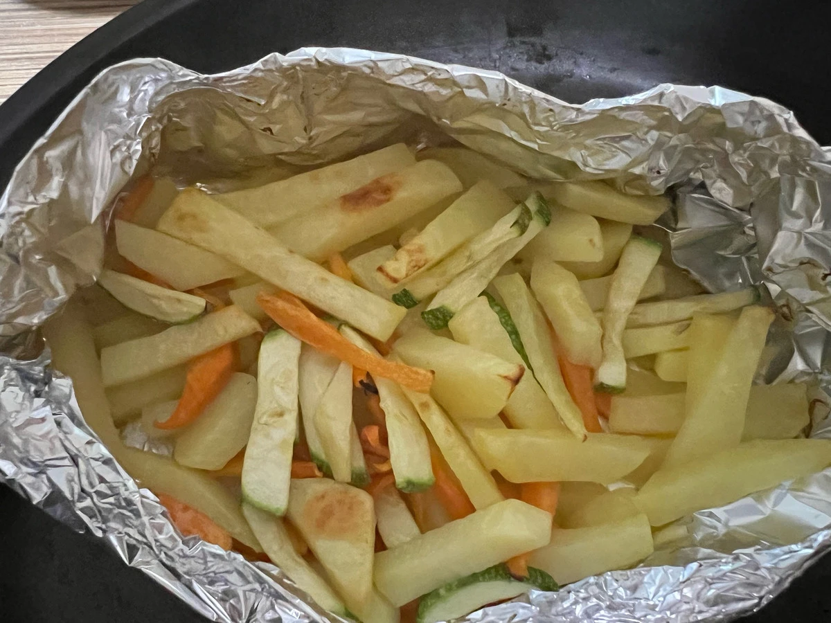 Переложите овощи в лодочку из фольги и запеките в духовке в течение 10-15 минут при 180 °C.