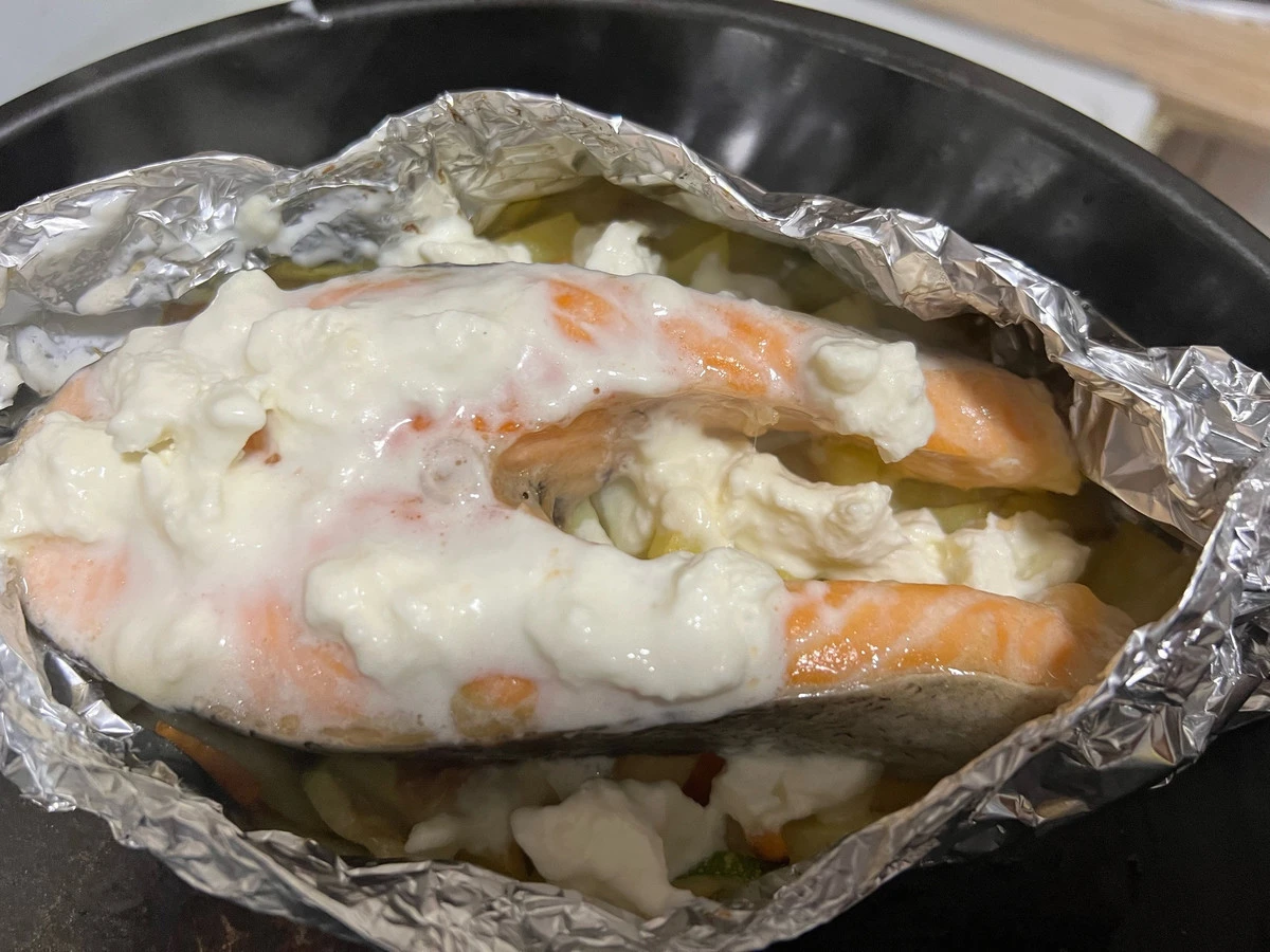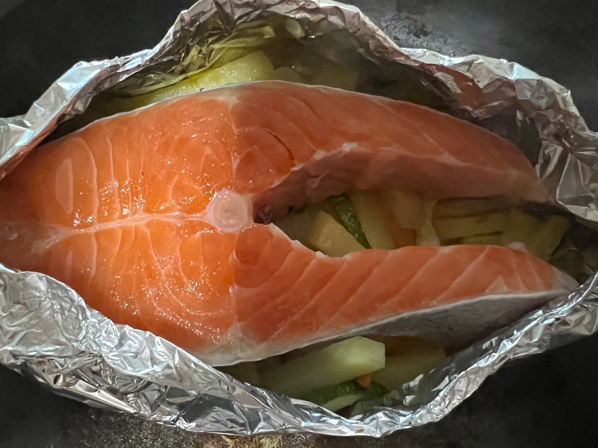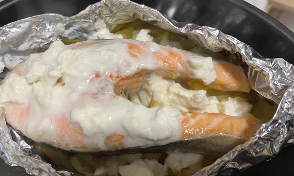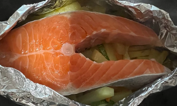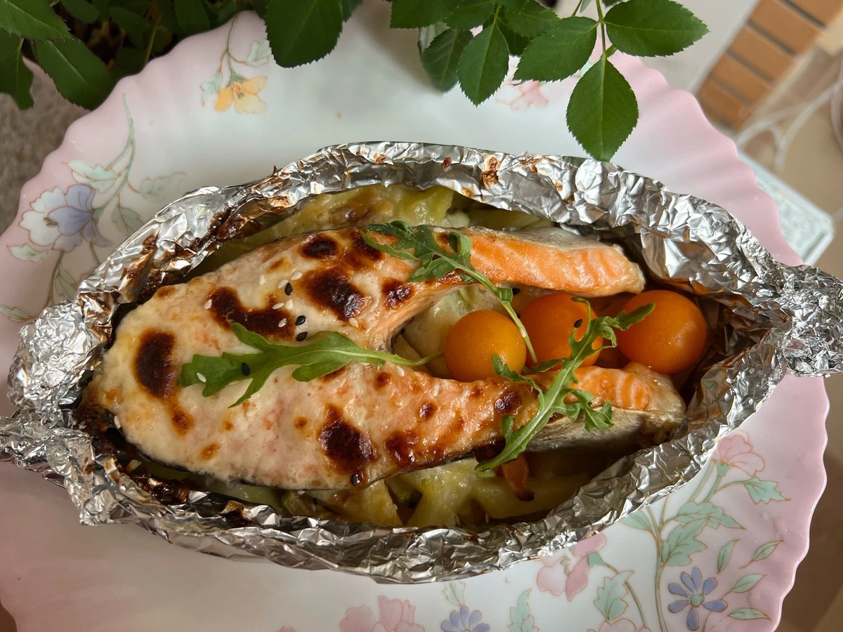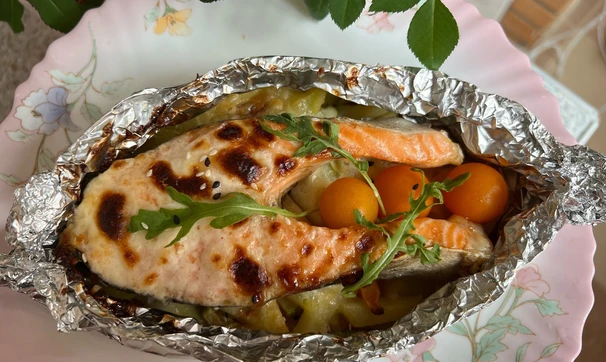Готовую рыбку переложите в тарелку прямо в лодочке из фольги и подайте к столу.