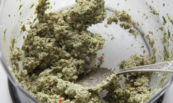 Грецкие орехи, кинзу, чеснок, соль и перец чили (небольшой кусочек) измельчите в блендере в мелкую крошку, добавьте лимонный сок и перемешайте.