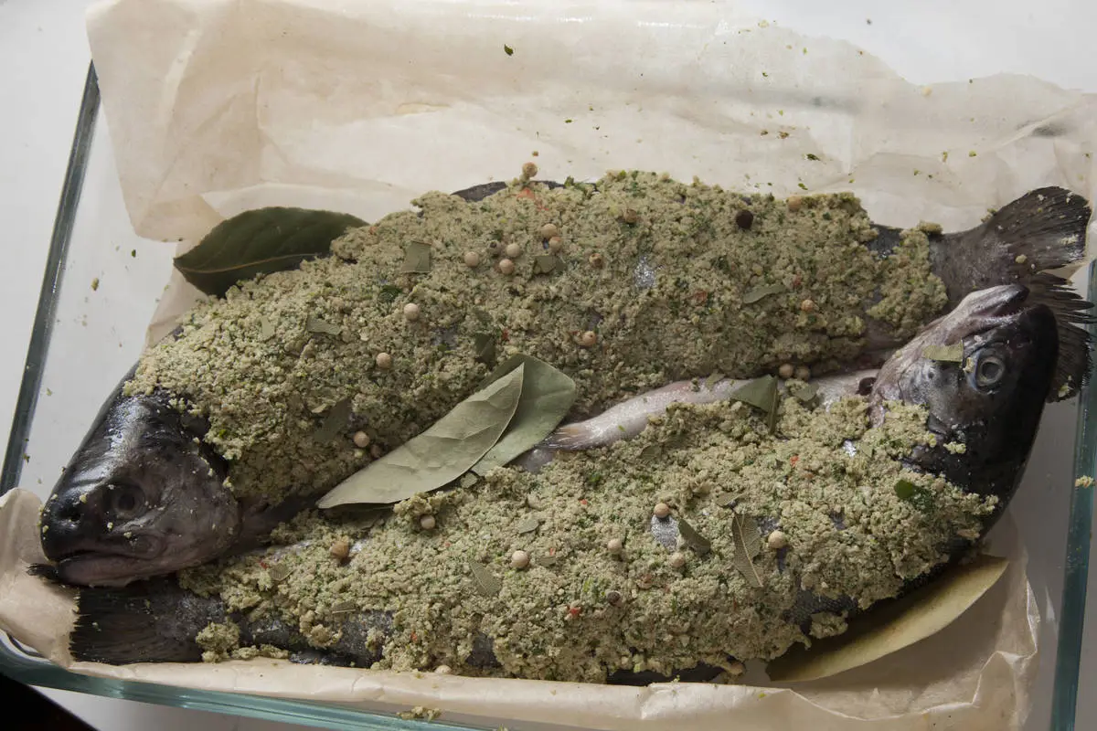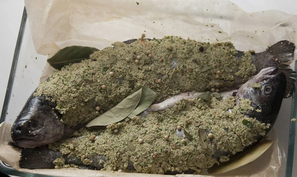 Получившейся пастой щедро намажьте форель со всех сторон, вложите немного в брюшко, выложите рыбу в форму для выпечки на пергамент, посыпьте сверху целыми горошинами перца, добавьте 2-3 лавровых листа и запекайте в разогретой до 180 С духовке около 15-ти минут. Приятного аппетита!