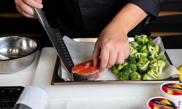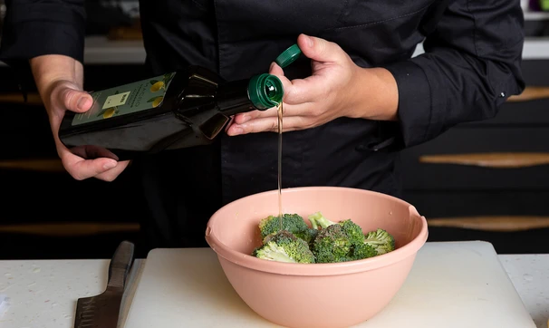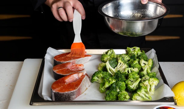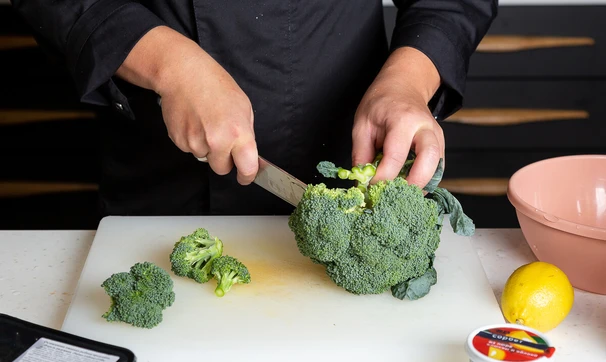 Если используете замороженные стейки форели, разморозьте их. Брокколи помойте, разберите на соцветия. Выложите в миску.