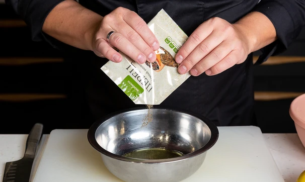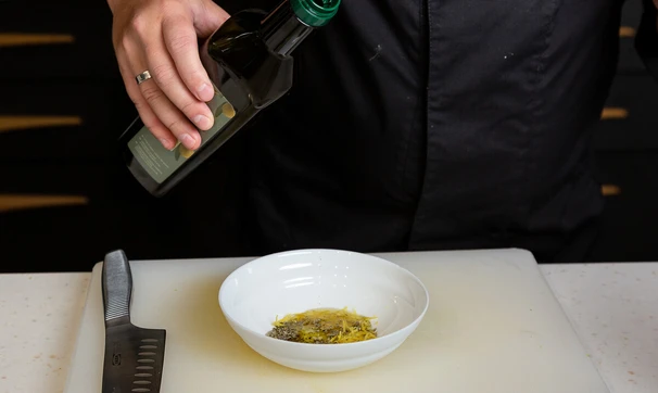 Сделайте масляный соус: в миску налейте 1 ст. л. оливкового масла, добавьте 2/3 ч. л. соли, 1/6 ч. л. молотого перца, перемешайте.