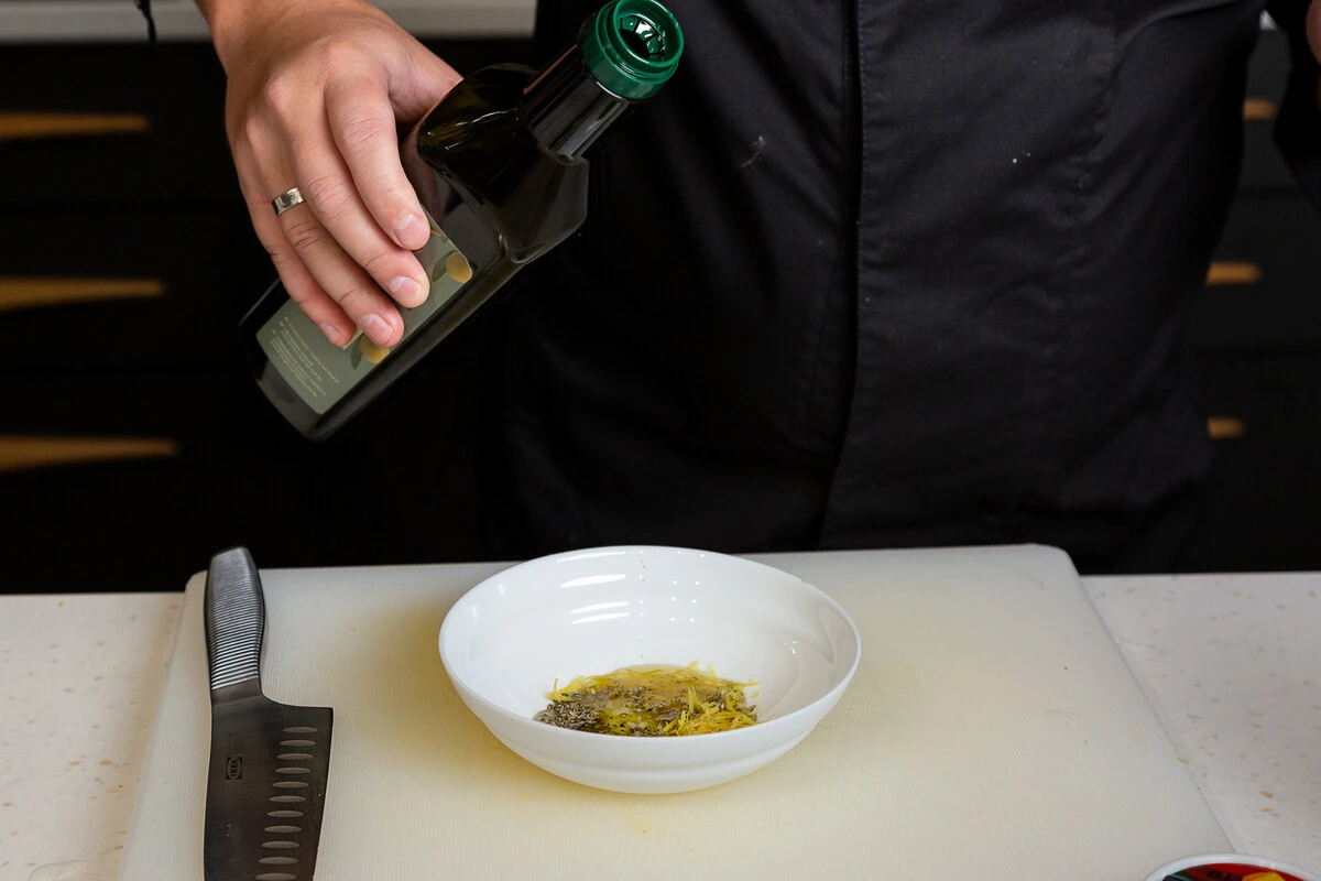 Пока запекаются рыба и брокколи, сделайте глазурь на основе сорбета. Натрите цедру лимона на мелкой тёрке в мисочку. Всыпьте чёрный перец, оливковое масло.