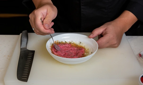 Сделайте соус. В стакан блендера выложите 125 г сорбета, добавьте жареный лук, соевый соус и смешайте всё вместе блендером.
