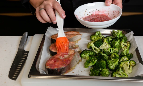 Смажьте запечённую рыбу глазурью на основе сорбета и запекайте ещё 4-5 минут при 180 ℃.