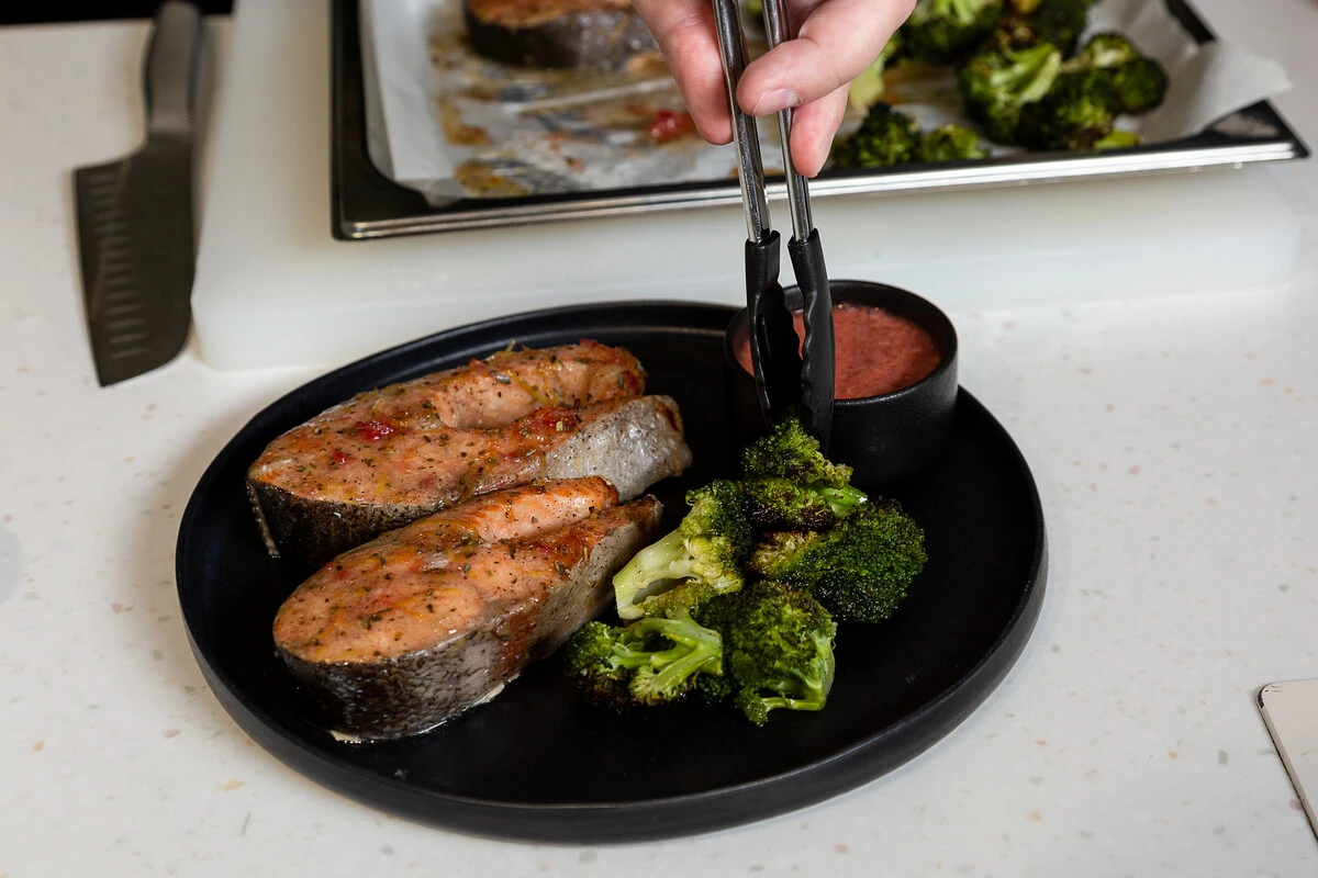 Запечённые стейки форели — всегда удачный вариант. Мы же добавили соус из яблочно-клюквенного сорбета, с ним рыба стала ещё нежнее и вкуснее. А запечённая брокколи на гарнир эффектно довершает блюдо. Попробуйте: это отличный вариант ужина, который можно приготовить и в обычный день, и на праздник.