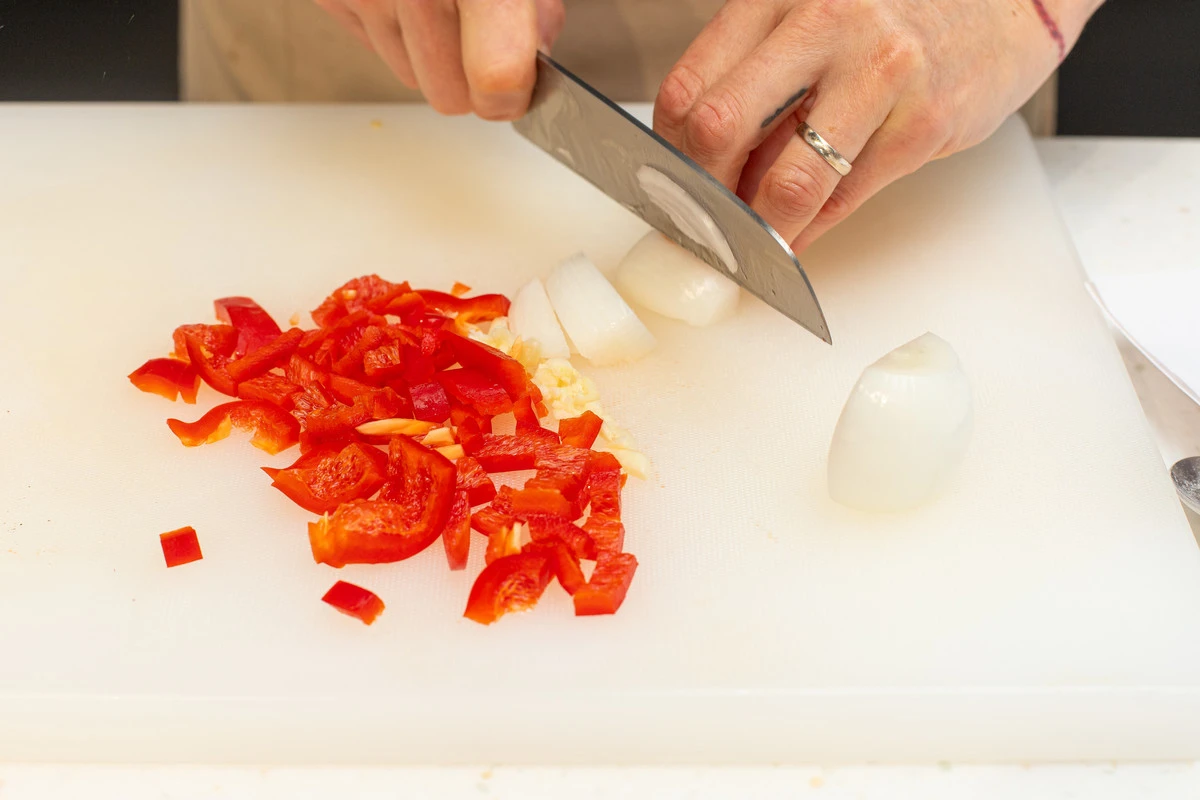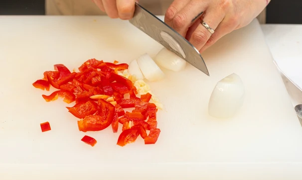 Болгарский перец и лук нарежьте кусочками среднего размера. Чеснок очистите, раздавите зубчик тыльной стороной ножа и мелко нарежьте или пропустите через пресс.