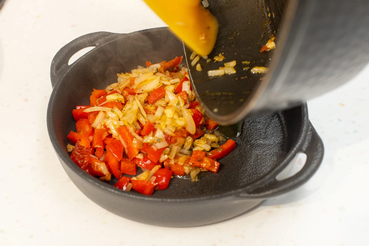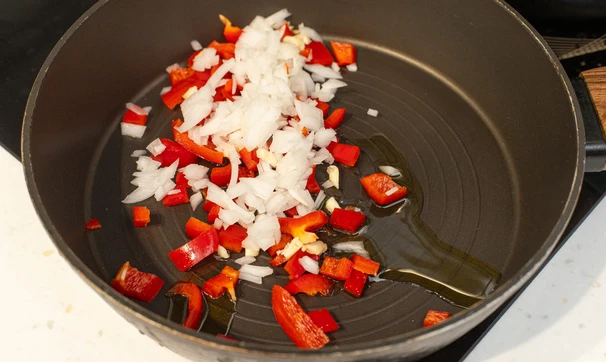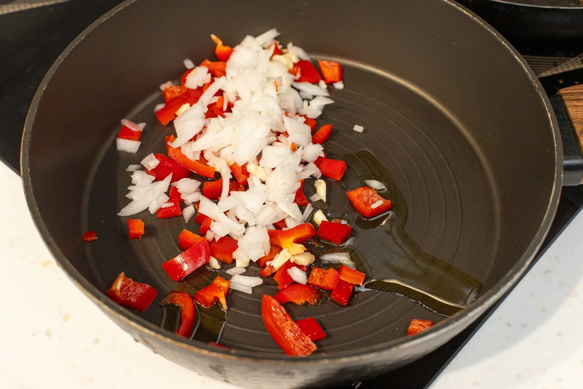 Разогрейте сковороду с оливковым маслом, выложите в неё перец, лук и чеснок и обжаривайте в течение 4-5 минут до золотистого цвета, периодически помешивая. Добавьте щепотку чёрного перца и орегано, перемешайте.