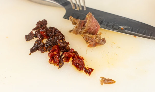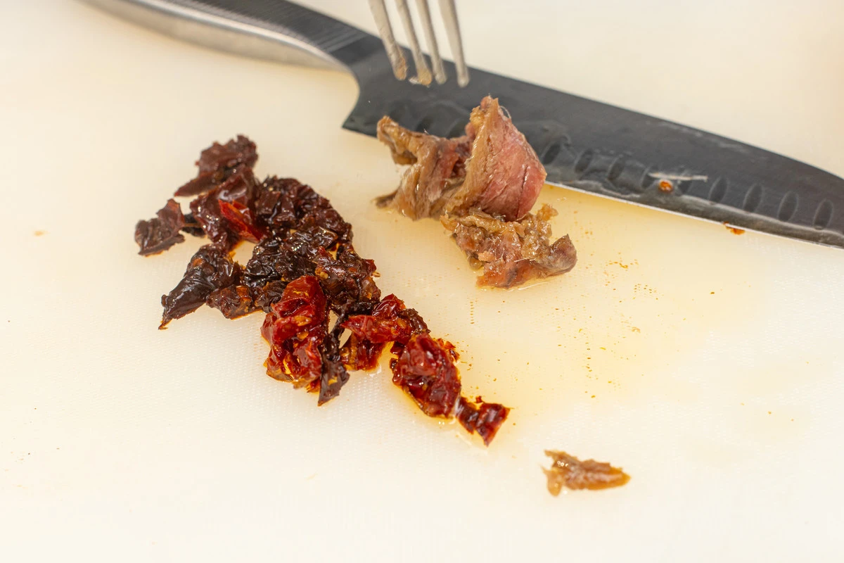 Вяленые томаты нарежьте. Анчоусы также можно нарезать по желанию. Анчоусы добавляйте по вкусу. Если любите, положите указанное в рецепте количество или чуть больше, если не очень любите или считаете их слишком солёными, добавьте меньше или совсем не кладите. Если анчоусы добавлять не будете, немного подсолите фриттату по вкусу.