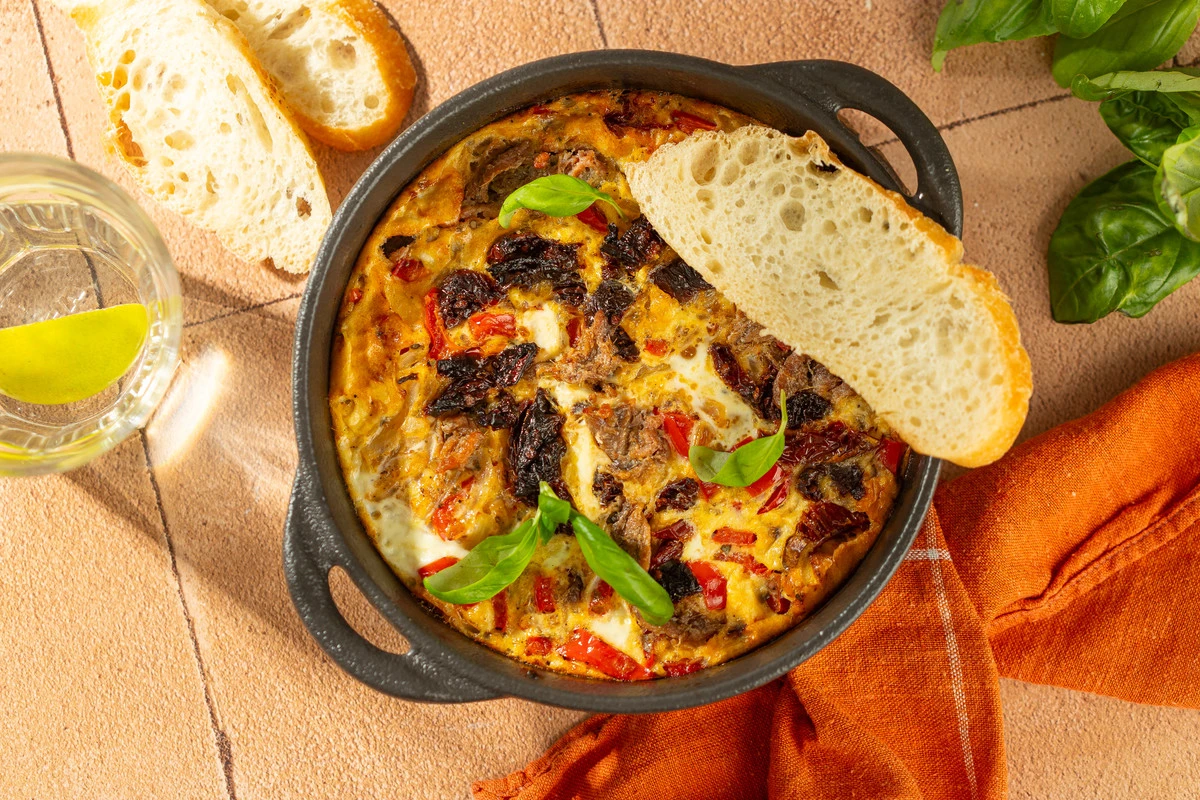 Налейте в форму для запекания немного оливкового масла. Выложите в неё перец с луком, вяленые томаты, анчоусы и залейте взбитыми яйцами. Запекайте в духовке при 180 °C до готовности яиц (в течение примерно 15 минут).