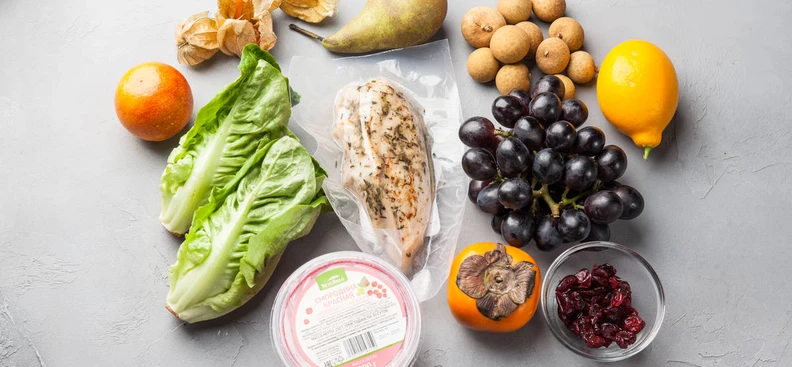 Подготовьте свежие овощи, фрукты и ягоды: промойте их водой, выдавите сок из лимона и апельсина, очистите лонган и разрежьте на половинки, виноград и физалис тоже. Грушу и хурму нарежьте небольшими дольками, листья салата порвите.