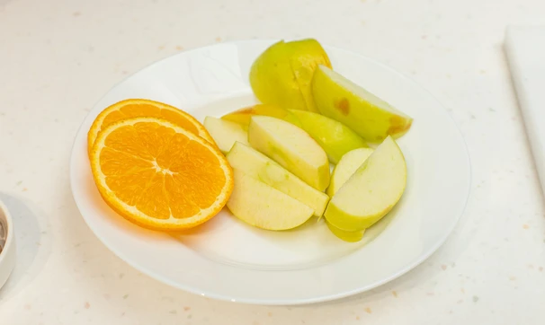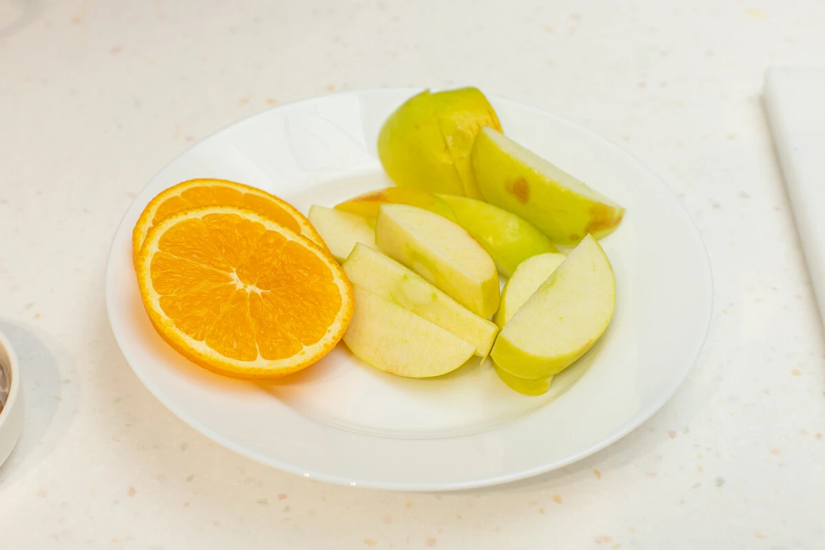 Фрукты помойте. Апельсин нарежьте кружочками, яблоко очистите от семечек и нарежьте дольками.