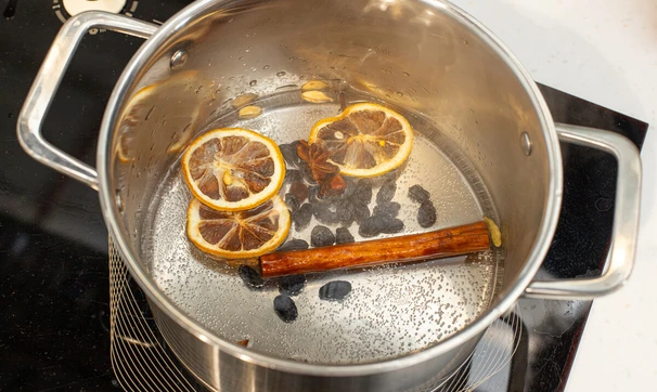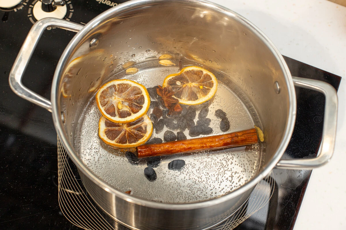 В небольшую кастрюлю налейте 100 мл воды, положите палочку корицы, бадьян, кардамон, гвоздику, изюм и сушёный апельсин. Доведите до кипения и кипятите 3-4 минуты.