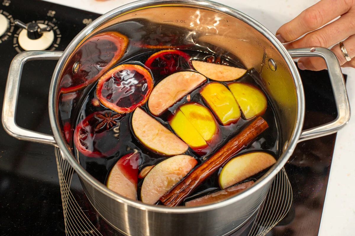 Добавьте два кружочка свежего апельсина и дольки яблока. Прогревайте всё вместе на медленном огне примерно 15-20 минут, напиток не должен кипеть!