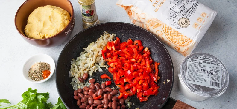 Лук и болгарский перец мелко нарежьте и обжарьте на оливковом масле 12-15 минут на среднем огне. Добавьте фасоль из банки и прогрейте ещё 5 минут.