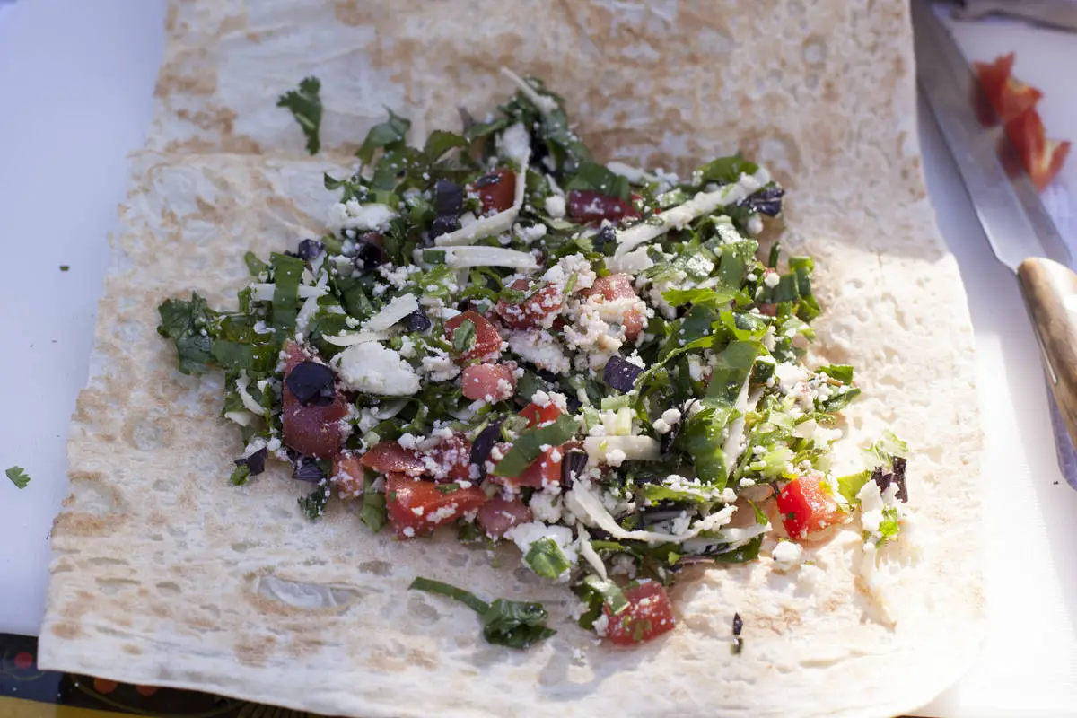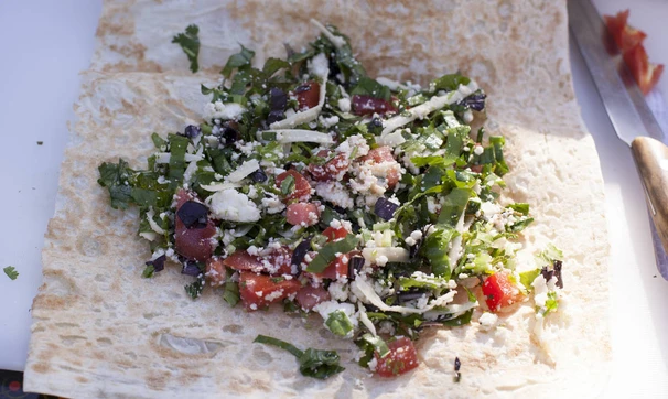 Каждый лист лаваша разрежьте на три прямоугольника, на каждый кусок выложите начинку и заверните конвертом.