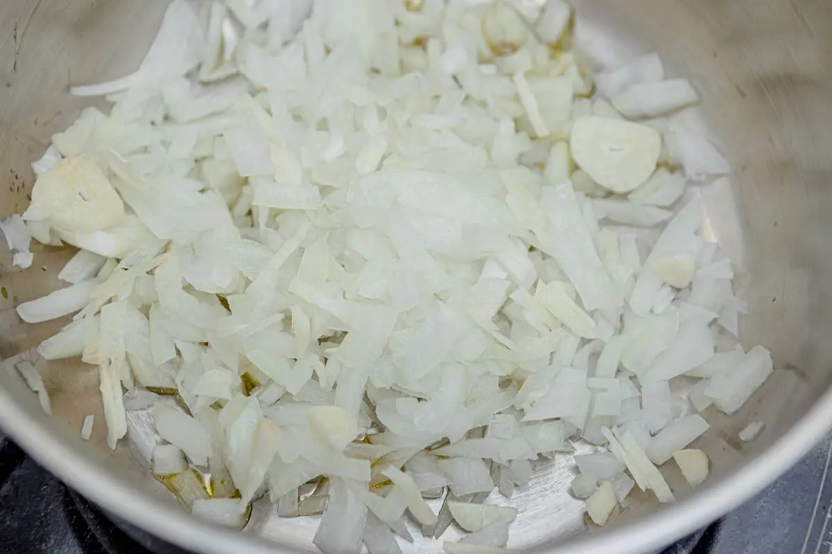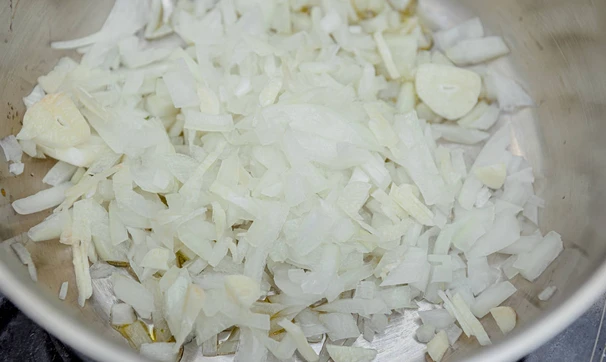 Лук и чеснок мелко нарежьте, обжарьте до прозрачности.