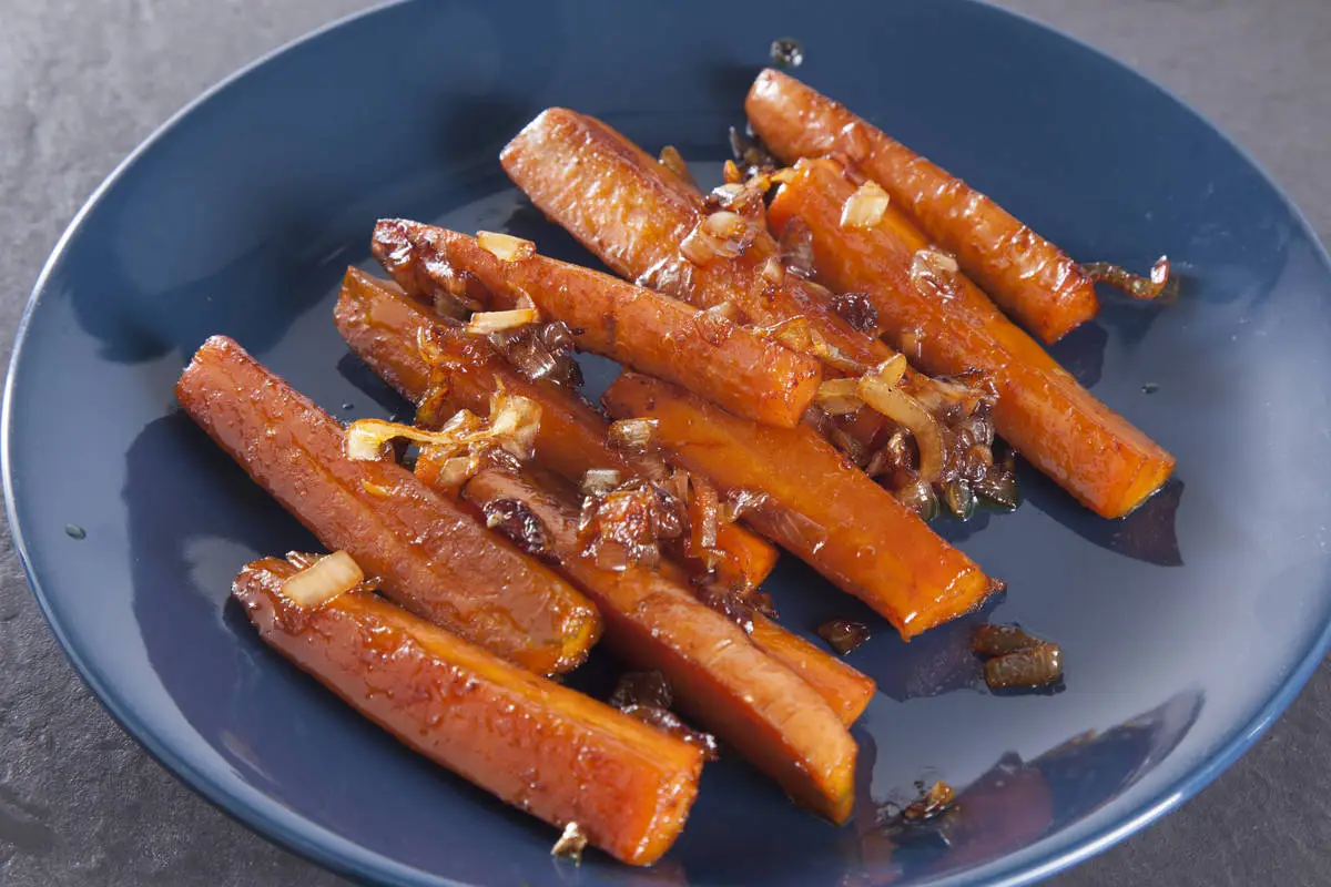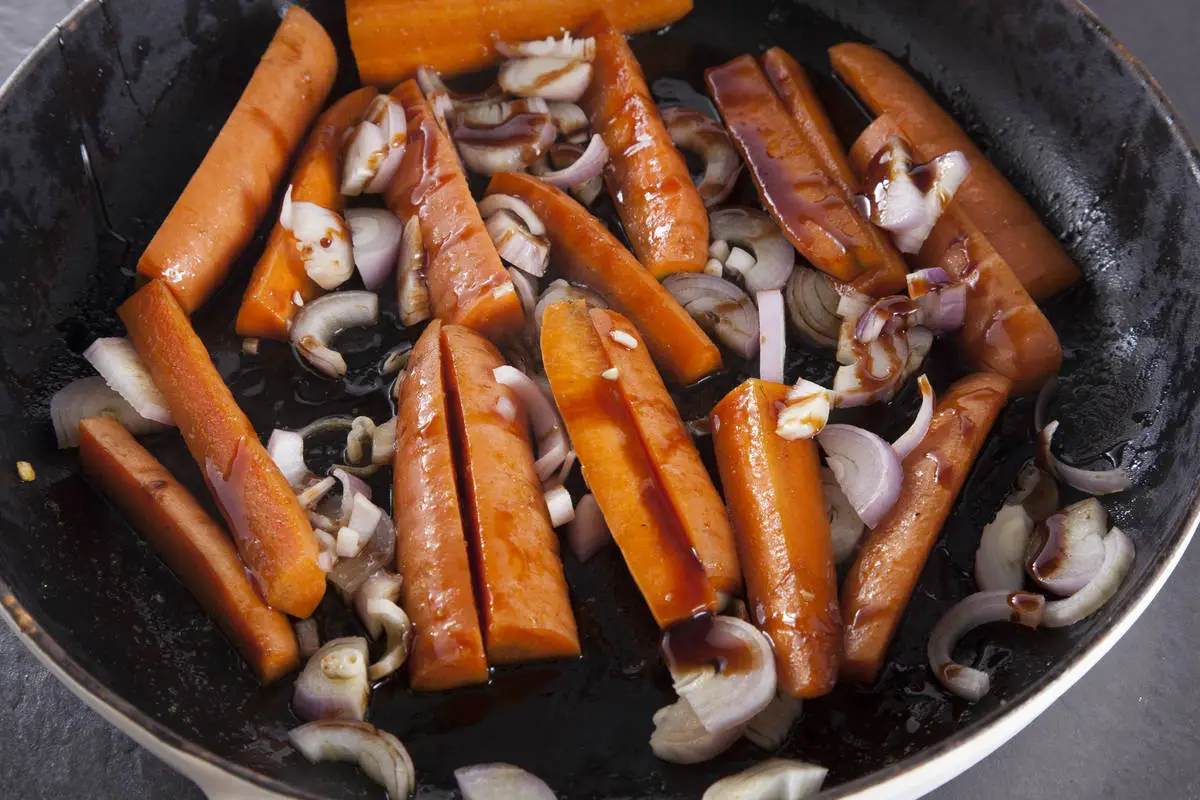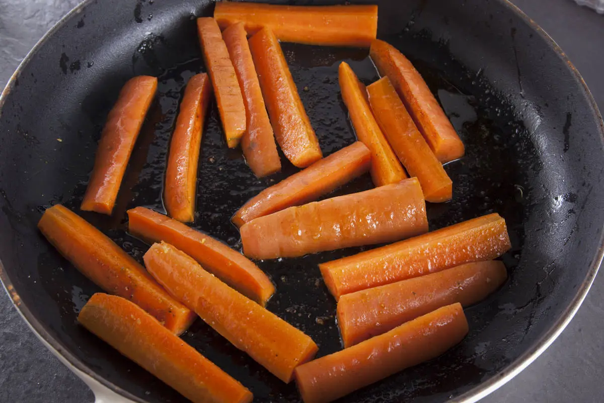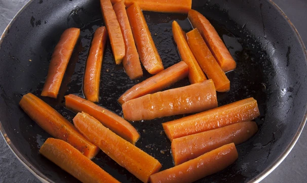 Морковь обжарьте на топленом масле, посолите, добавьте специи и финиковый сироп, накройте крышкой и томите на среднем огне около получаса.
