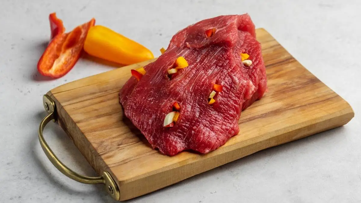 Чеснок, небольшой кусочек болгарского перца и свежий перец чили нарежьте тонкими полосками. В куске мяса сделайте надрезы с помощью ножа — по всей площади куска и со всех сторон. В надрезы положите вместе чеснок, перец болгарский и перец чили.