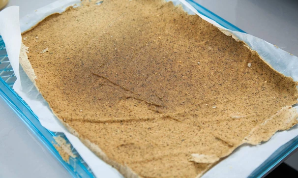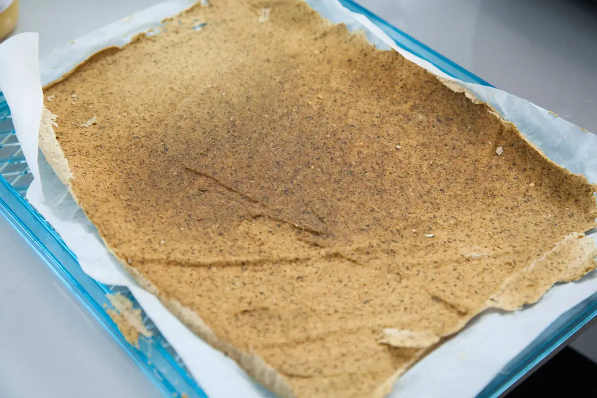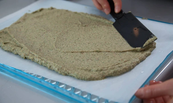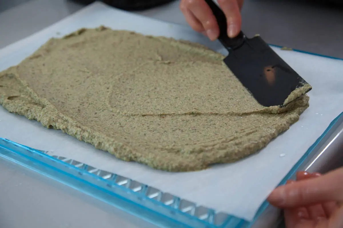 Выложить тонким слоем на лист (или пергамент) дегидратора или на противень.