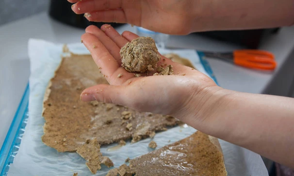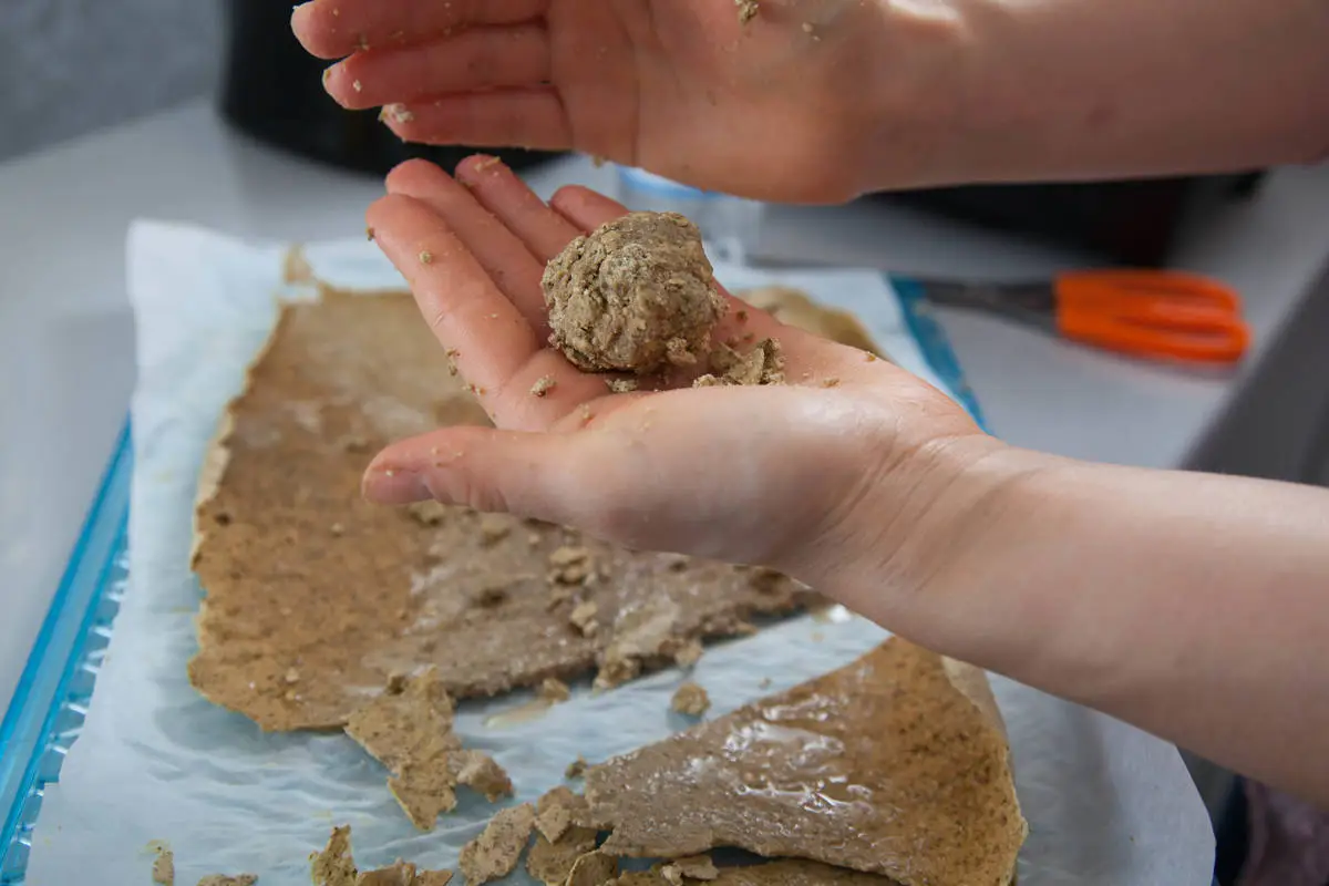 Если используете дегидратор (или сушилку), то сушить массу часов 4-6 при температуре 50-55 градусов. Если температура будет ниже, сушить надо будет дольше. Если в дело идет духовка, то сушить массу надо с приоткрытой дверцей. Если есть режим "конвекция", то лучше включить его. Масса должна высохнуть не полностью, должна остаться немного влажноватой.