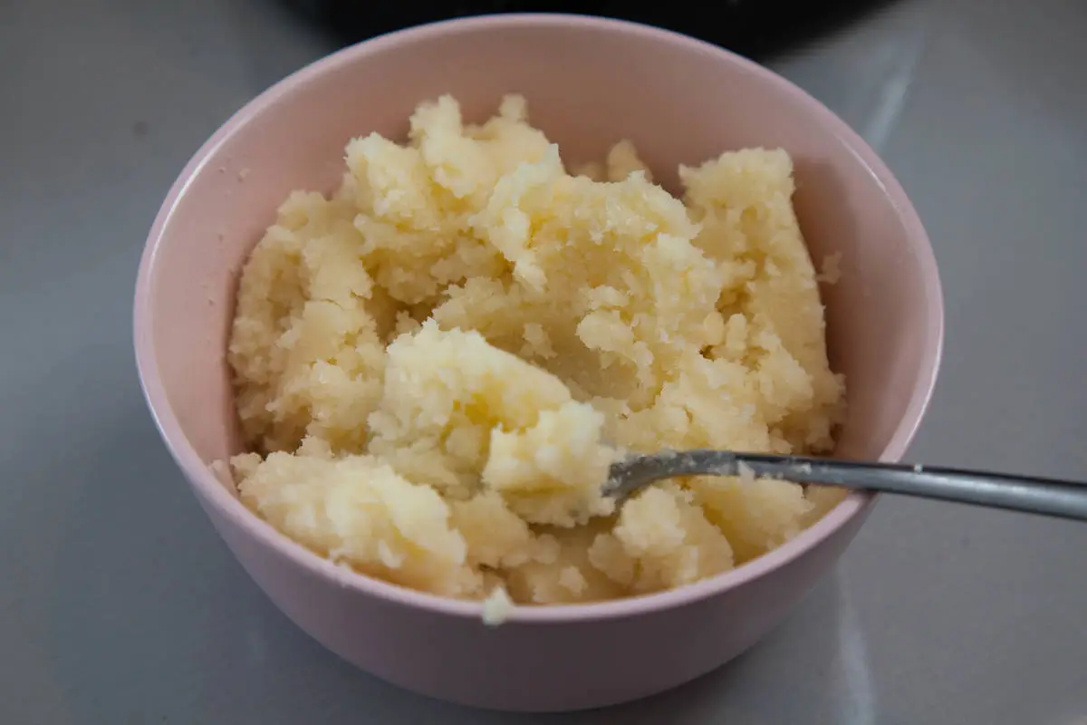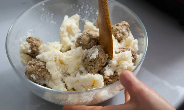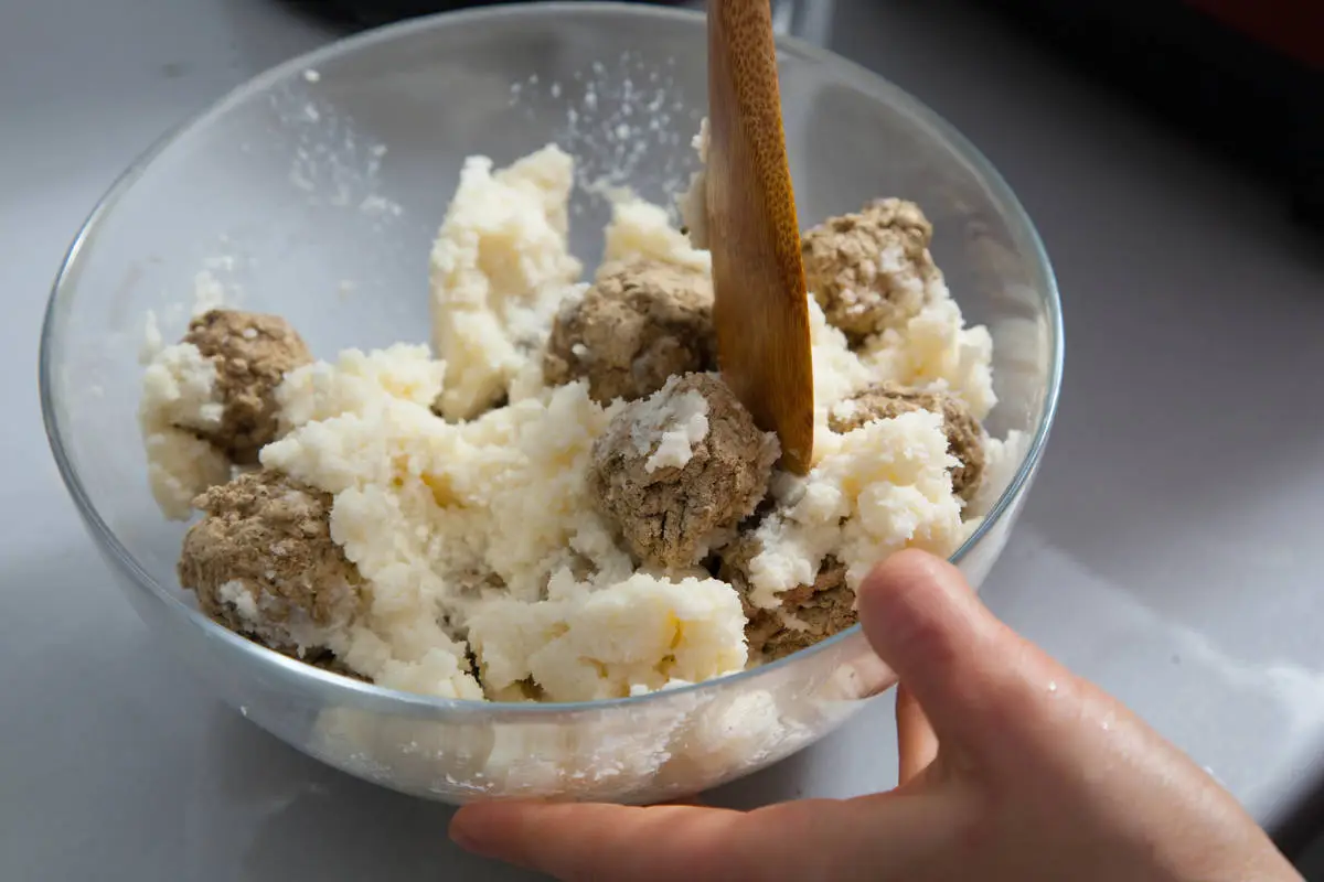 Сложите подсушенные шарики в миску, добавьте белый крем и смешайте.