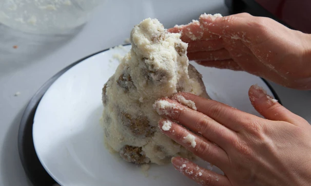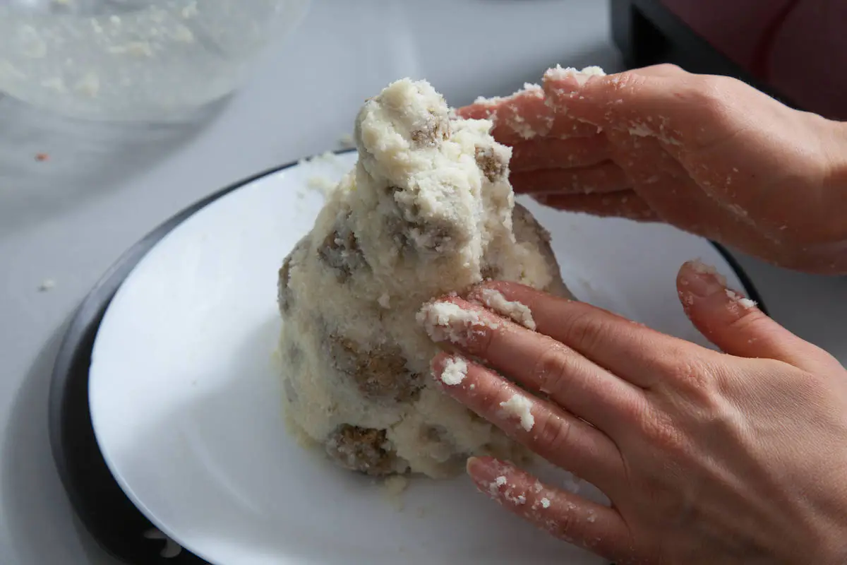 Из массы слепить шарики примерно одинакового размера, предварительно нарезав "тесто" на полоски. Смачивайте руки при лепке – будет легче.