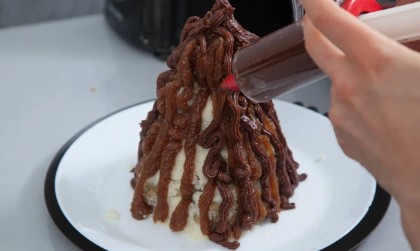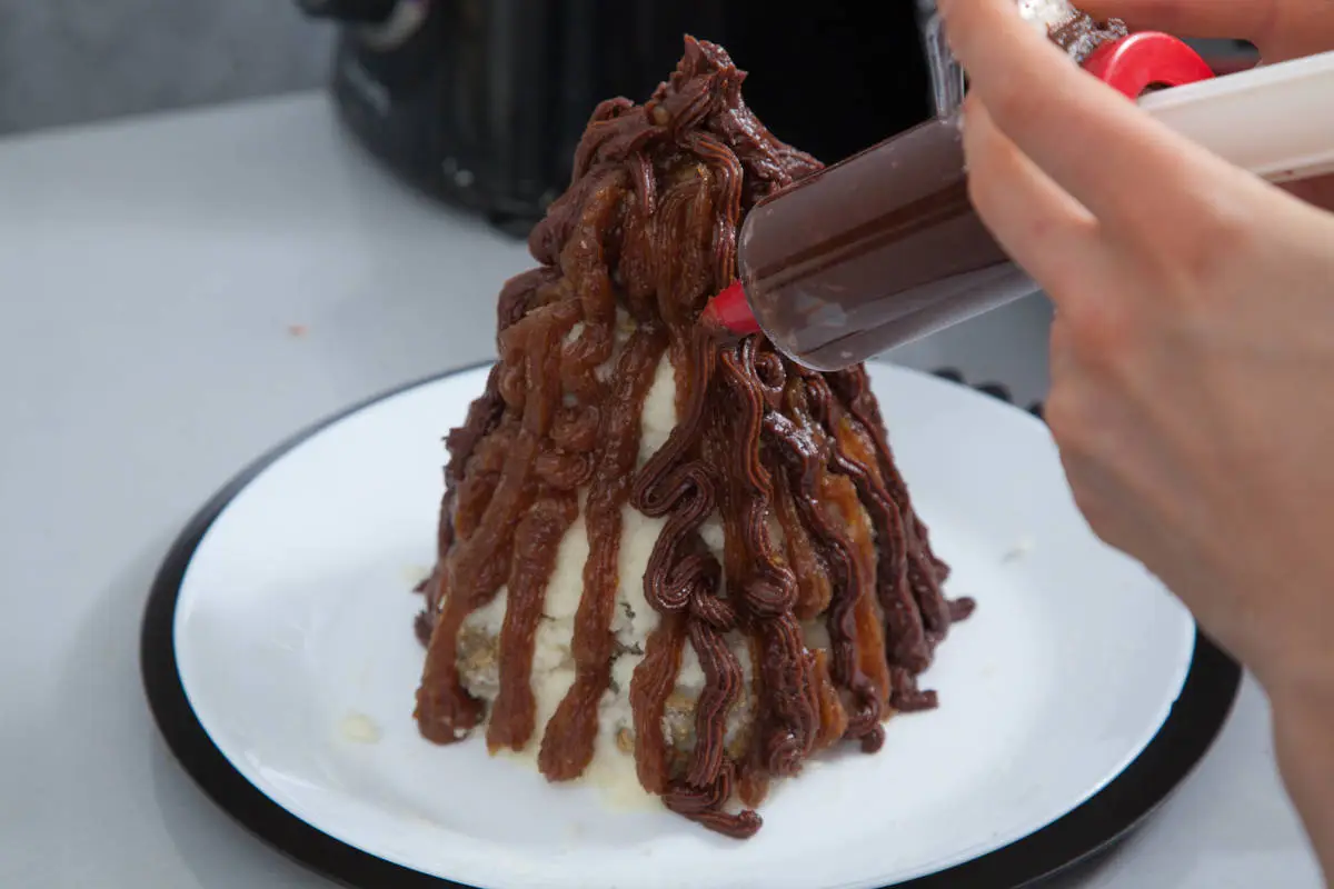 Из ингредиентов для темного крема получается целых два варианта. Сначала в блендере смешайте финики до однородной массы, добавляя постепенно воды. Разделите "крем" на две части. В одну из них добавьте какао-порошок и снова взбейте в блендере. Этими "кремами" будем украшать торт.