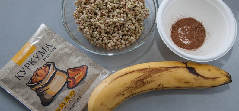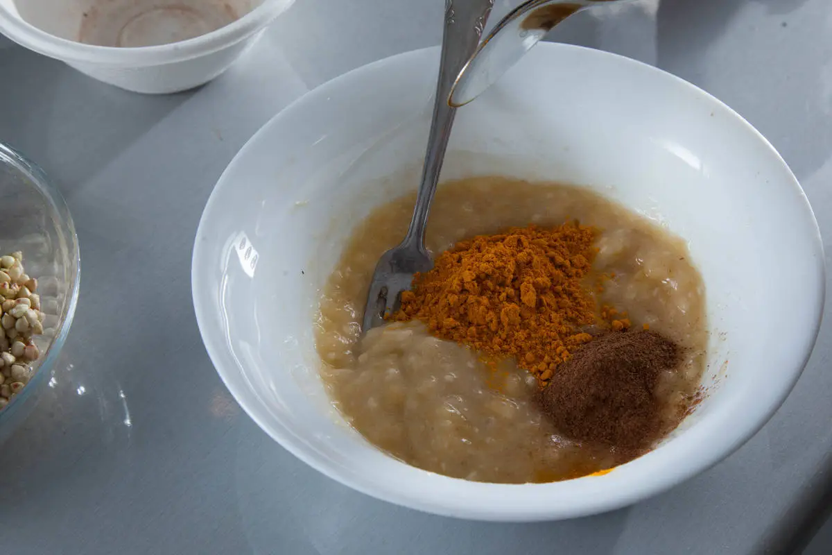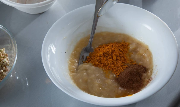 Пюрируйте банан с помощью вилки или блендера, добавьте куркуму и корицу, если используете.