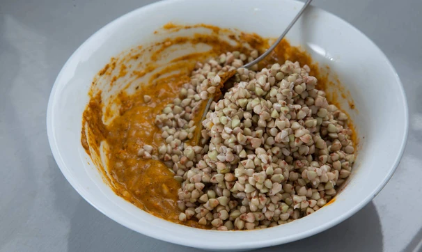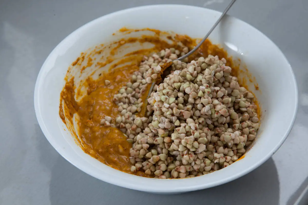 Смешайте с промытыми проростками гречки.