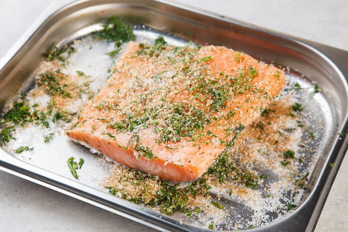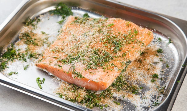 Филе разморозьте, промойте и обсушите салфетками, разрежьте на три куска. Смешайте соль, сахар, молотый перец и мелко порубленный укроп. Обваляйте рыбу в получившейся смеси.
