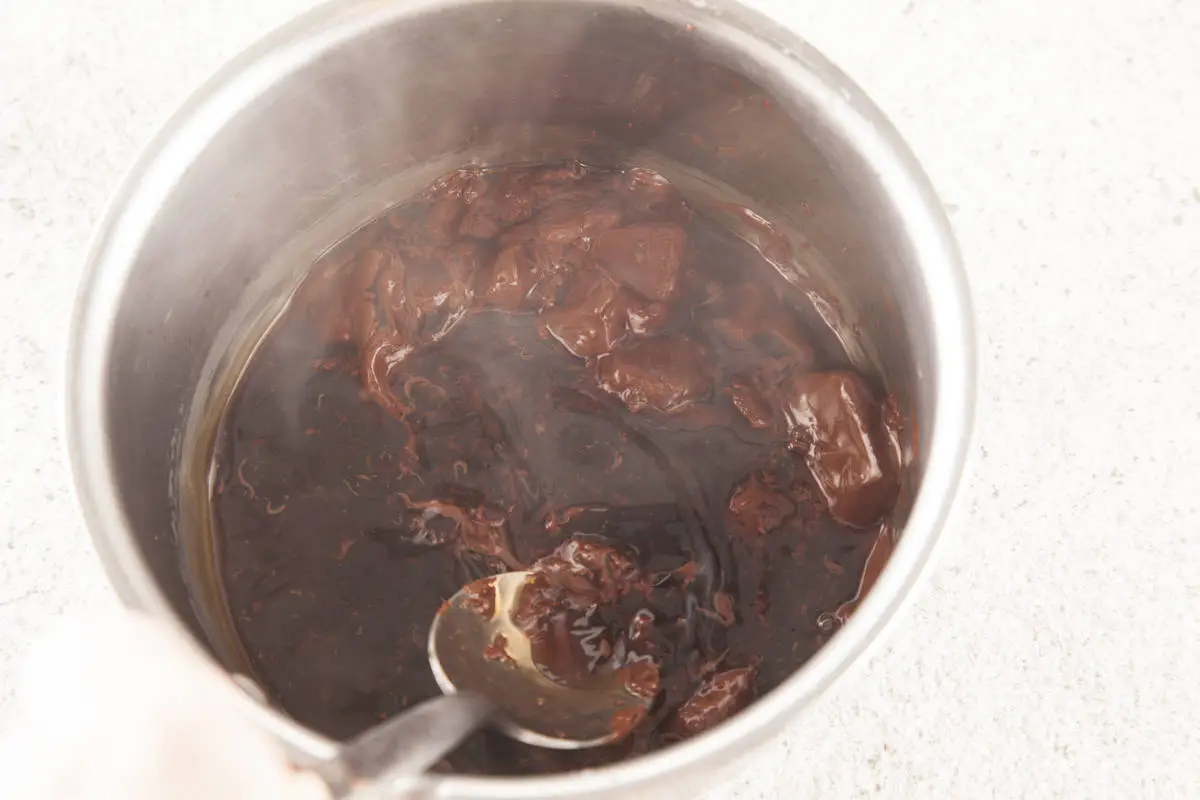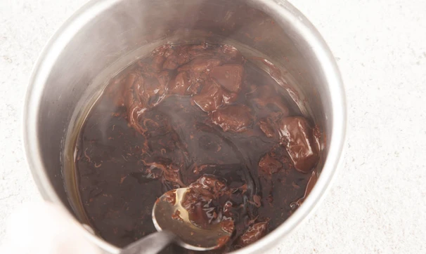 Для соуса смешайте соевый соус с 1 ст. ложкой воды и перцем, доведите до кипения, высыпьте порубленный шоколад и снимите с огня, активно мешайте, пока соус не станет гладким и однородным.