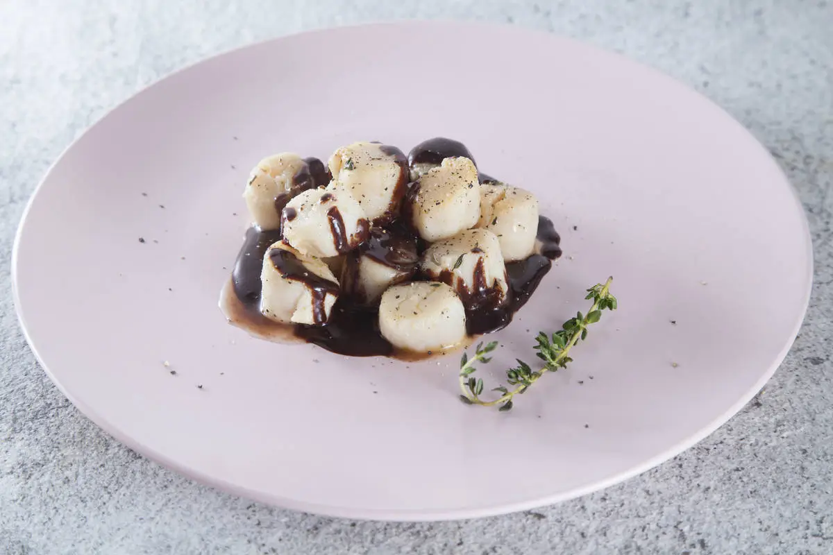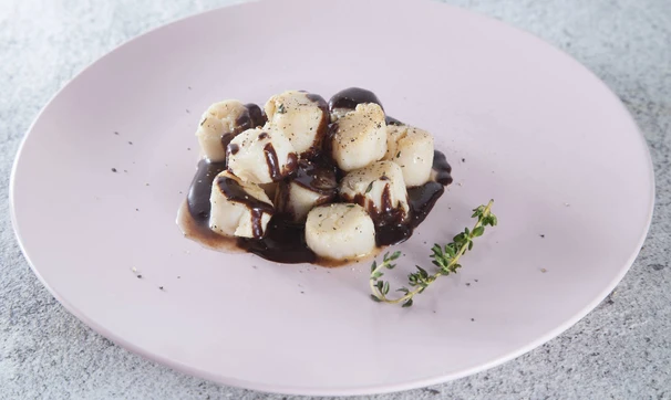 Готовые гребешки выложите на тарелки, полейте шоколадным соусом, подавайте.