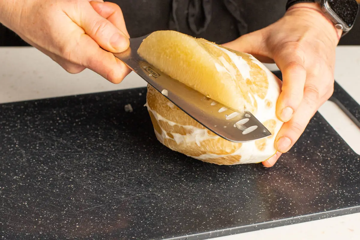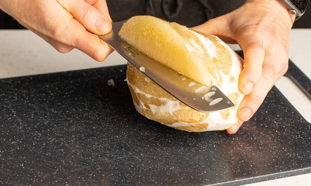 У помело срежьте кожуру ножом, аккуратно вырежьте дольки без белой части.