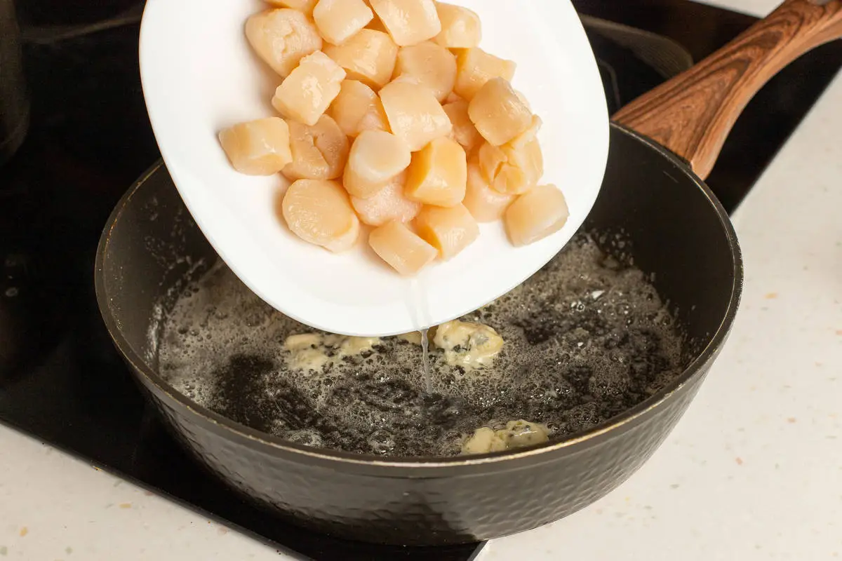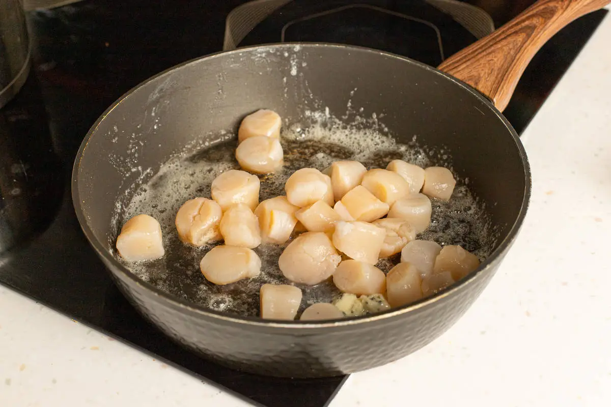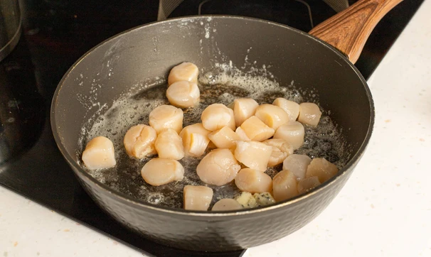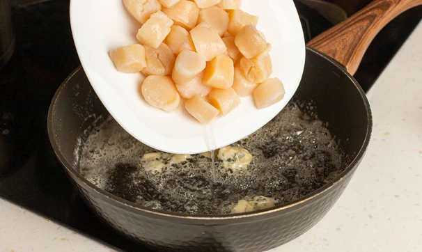 Гребешки разморозьте заранее в холодильнике или за полчаса до готовки в ледяной воде прямо в упаковке.
