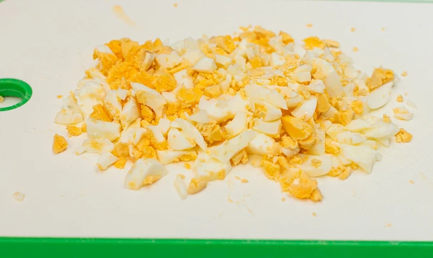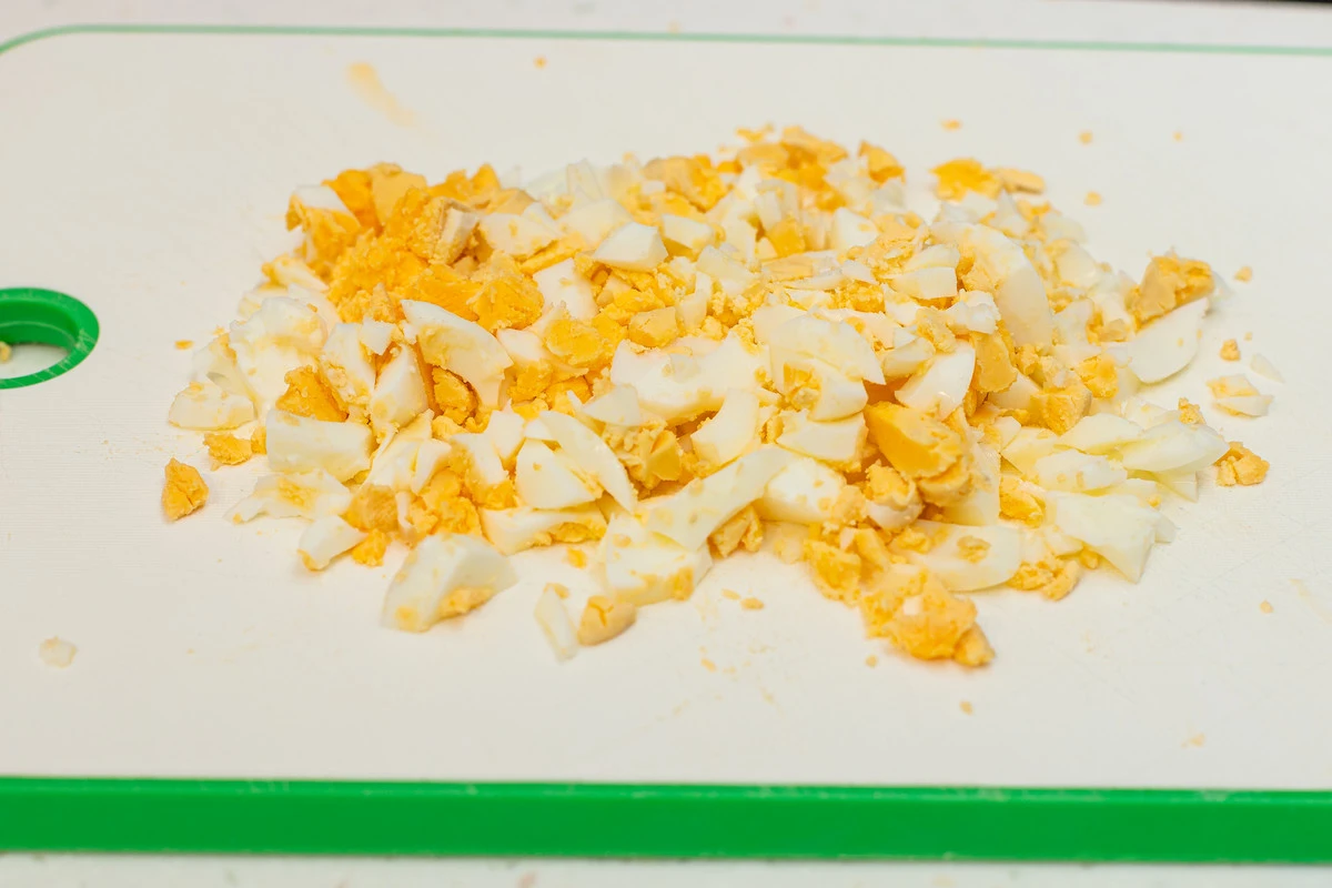 Яйца сварите вкрутую, остудите и очистите от скорлупы, мелко нарежьте.