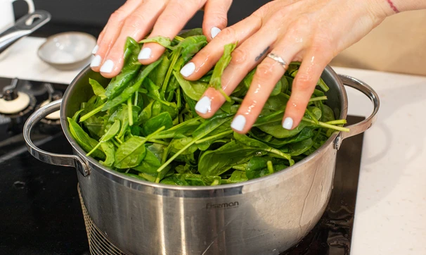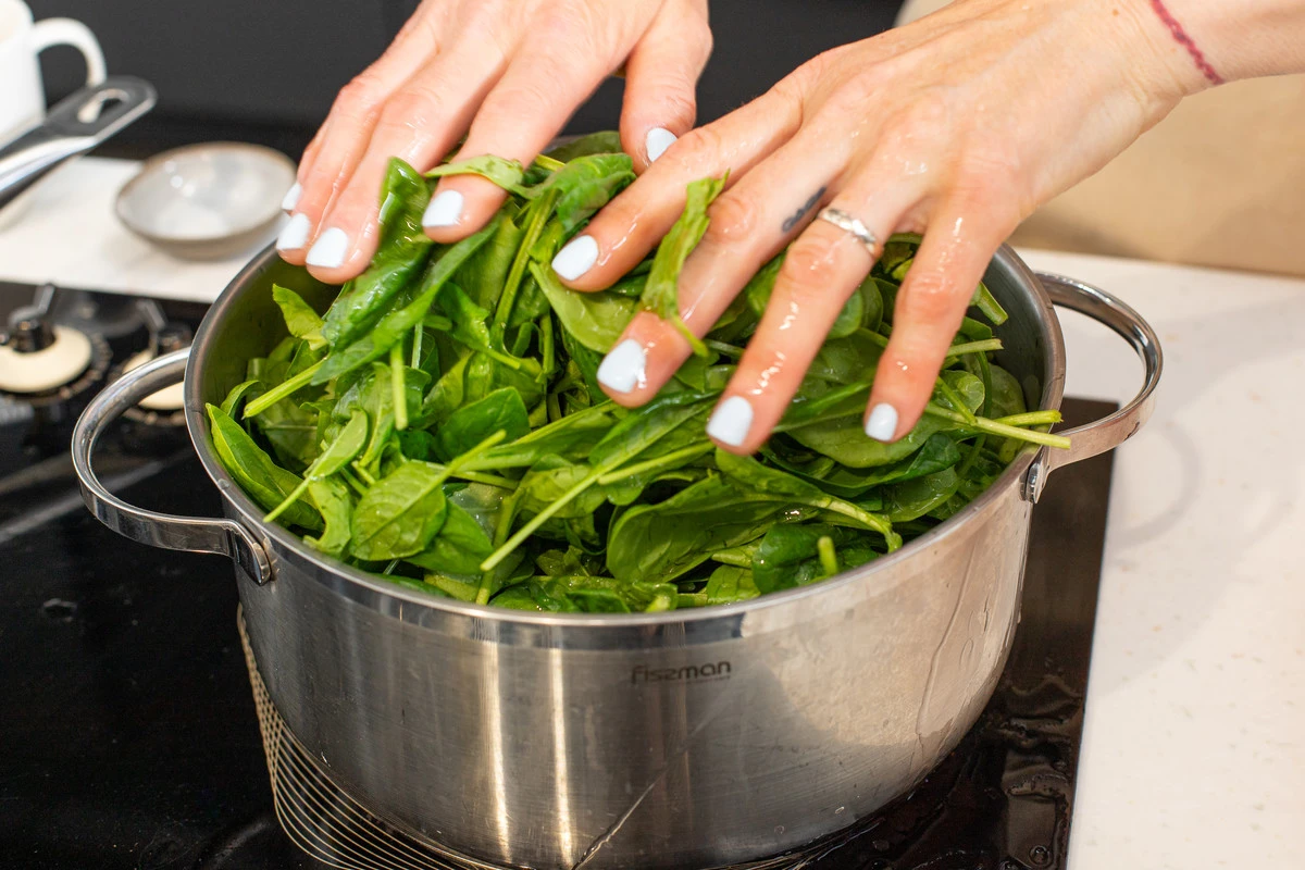 Шпинат бланшируйте в кипящей воде одну минуту. Затем откиньте на сито и дайте стечь воде.