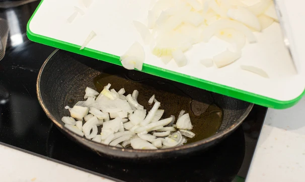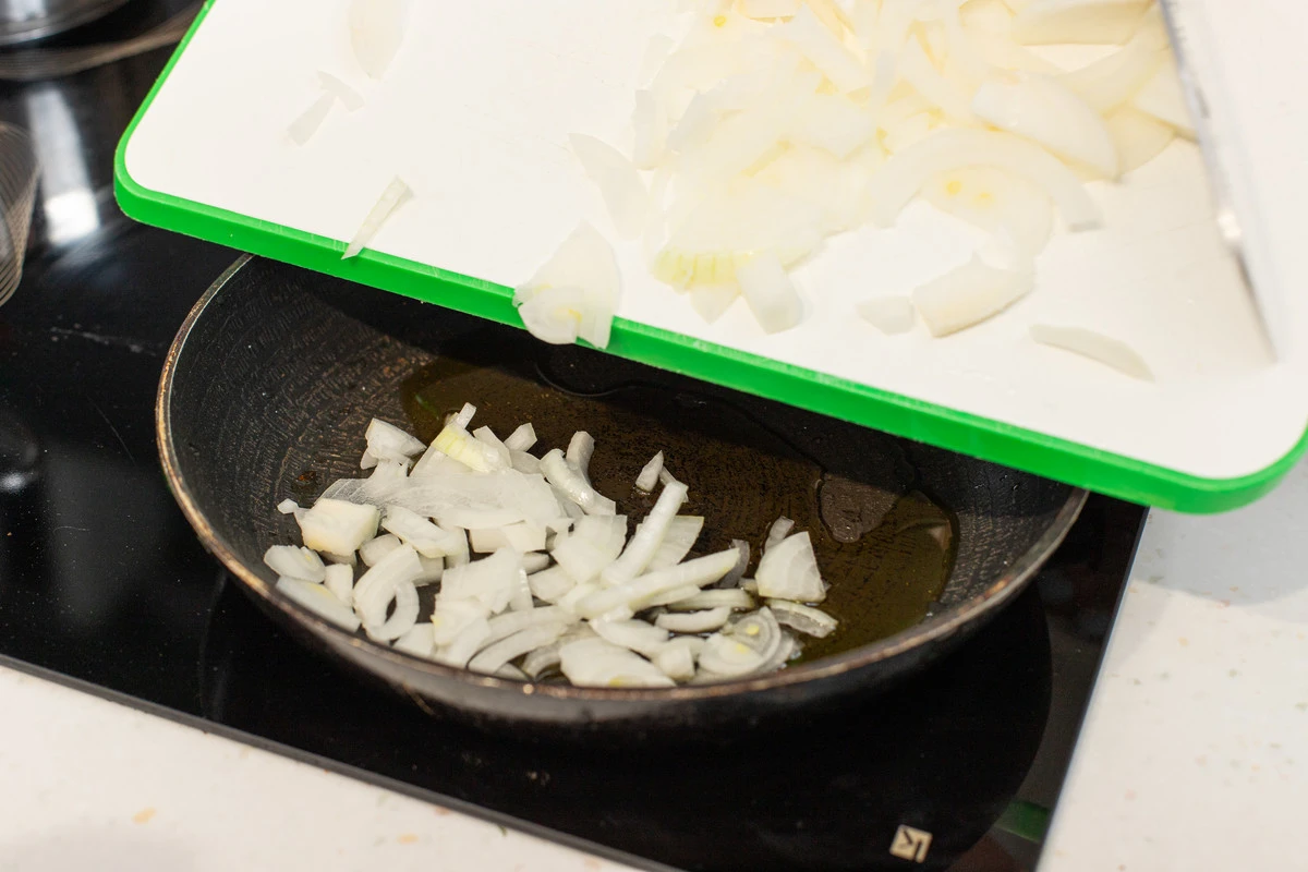 Лук очистите, тонко нарежьте и обжарьте на оливковом масле до золотистости.