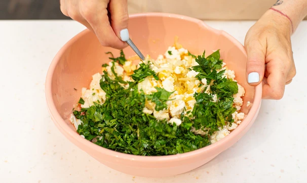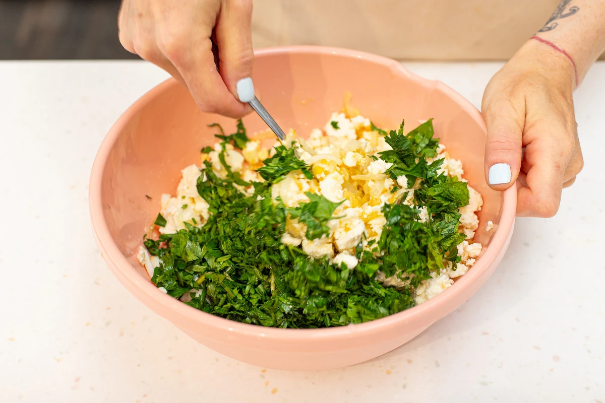 В миске смешайте яйца, обжаренный лук, мяту и покрошите фету. Добавьте шпинат, посолите и перемешайте.